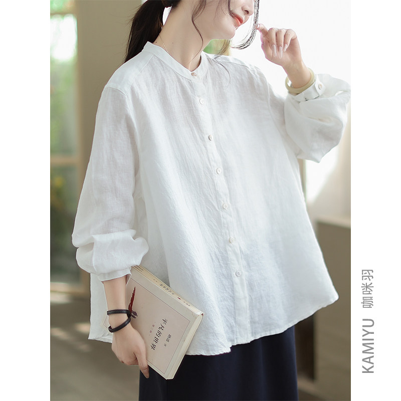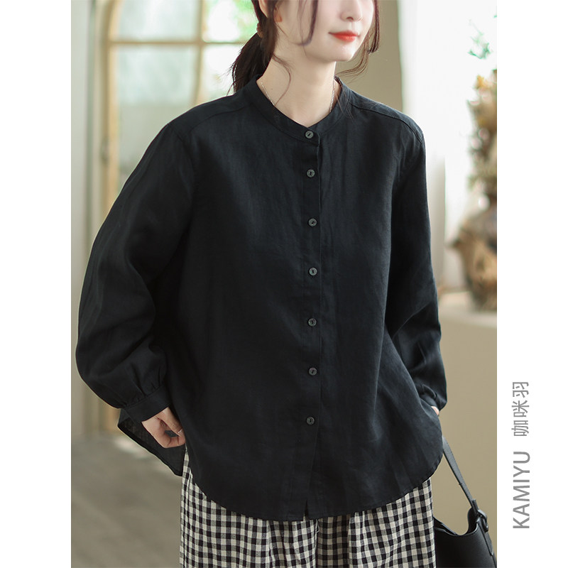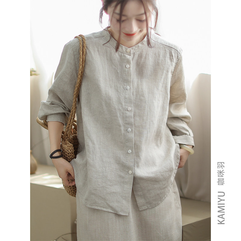 咖咪羽100%亚麻纯色衬衫外套秋季通勤开衫单排扣新款上衣女