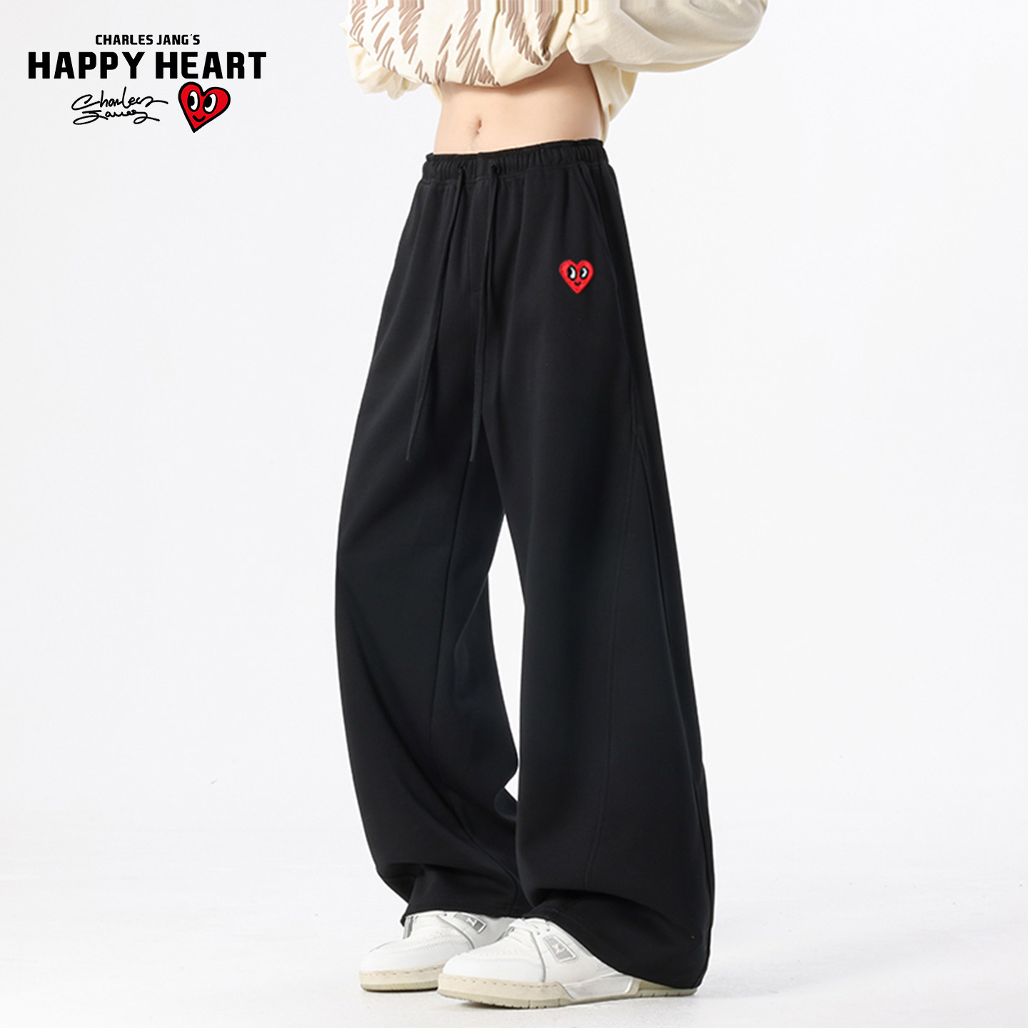 查尔斯桃心新款休闲裤男春秋季条纹拼接爱心刺绣直筒阔腿长裤子