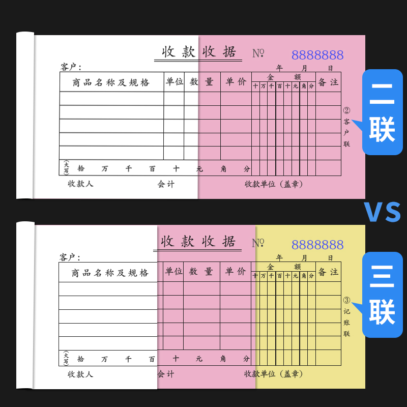 50本收据收款收据单栏多栏二联三联送货单23联连两联收据本单收款本收剧单据无碳复写销货单餐饮财会财务用品