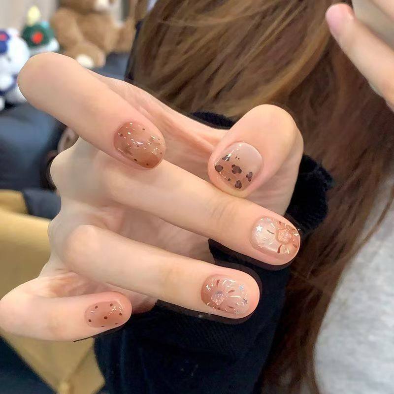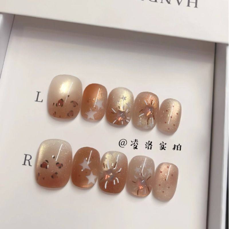 焦糖琥珀豹纹星星手工美甲穿戴甲短款高级ins网红可爱辣妹学生