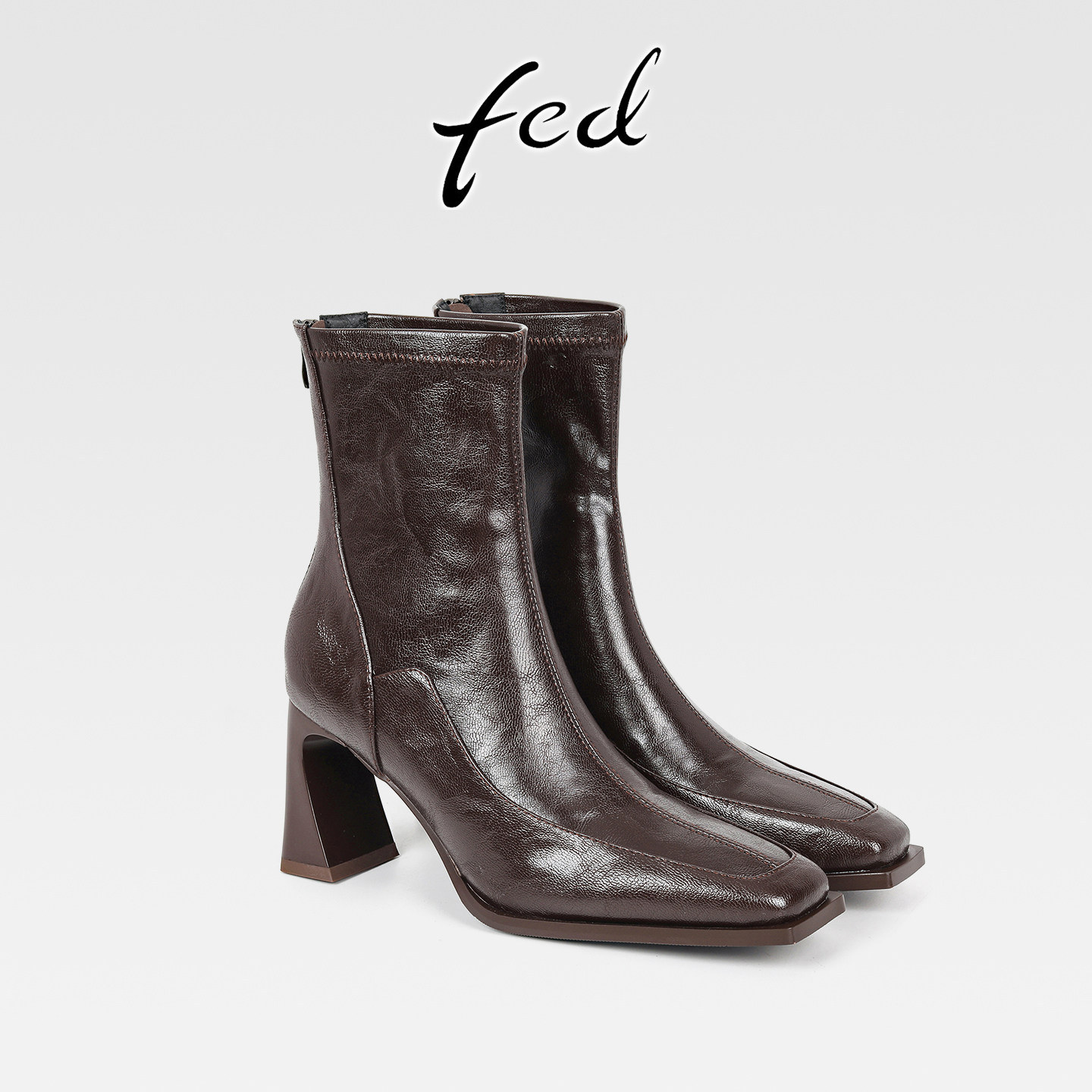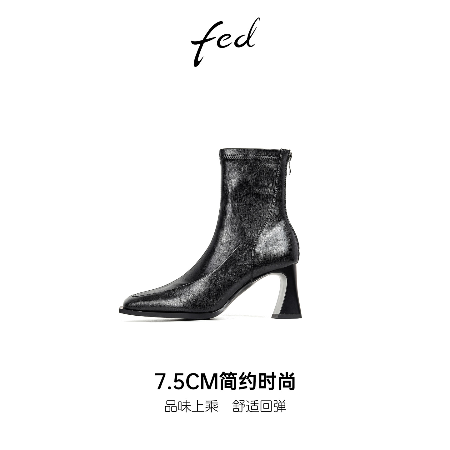 fed法式真皮粗跟弹力瘦瘦靴女秋冬新款后拉链气质方头高跟小短靴