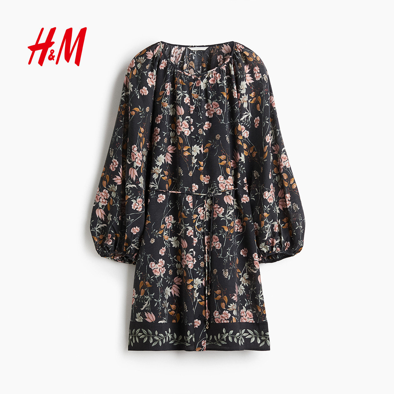 HM女装连衣裙冬季腰部系带大廓形喇叭形连衣裙1297142