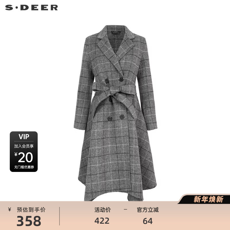 sdeer圣迪奥女装西装领格纹收腰毛呢长款大衣S22482513