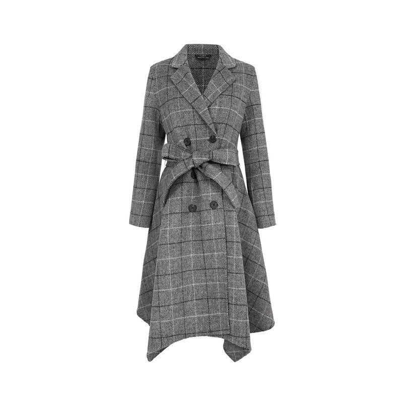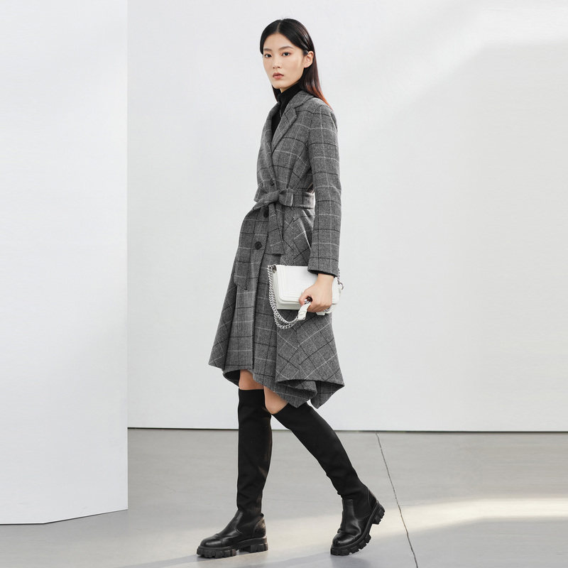 西装领 毛呢大衣 收腰格纹