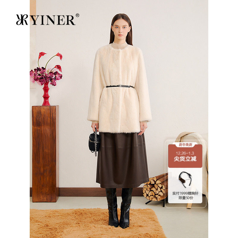 YINER音儿专选2025冬季新款法式绒感水貂毛皮珍珠色撞色腰带皮草