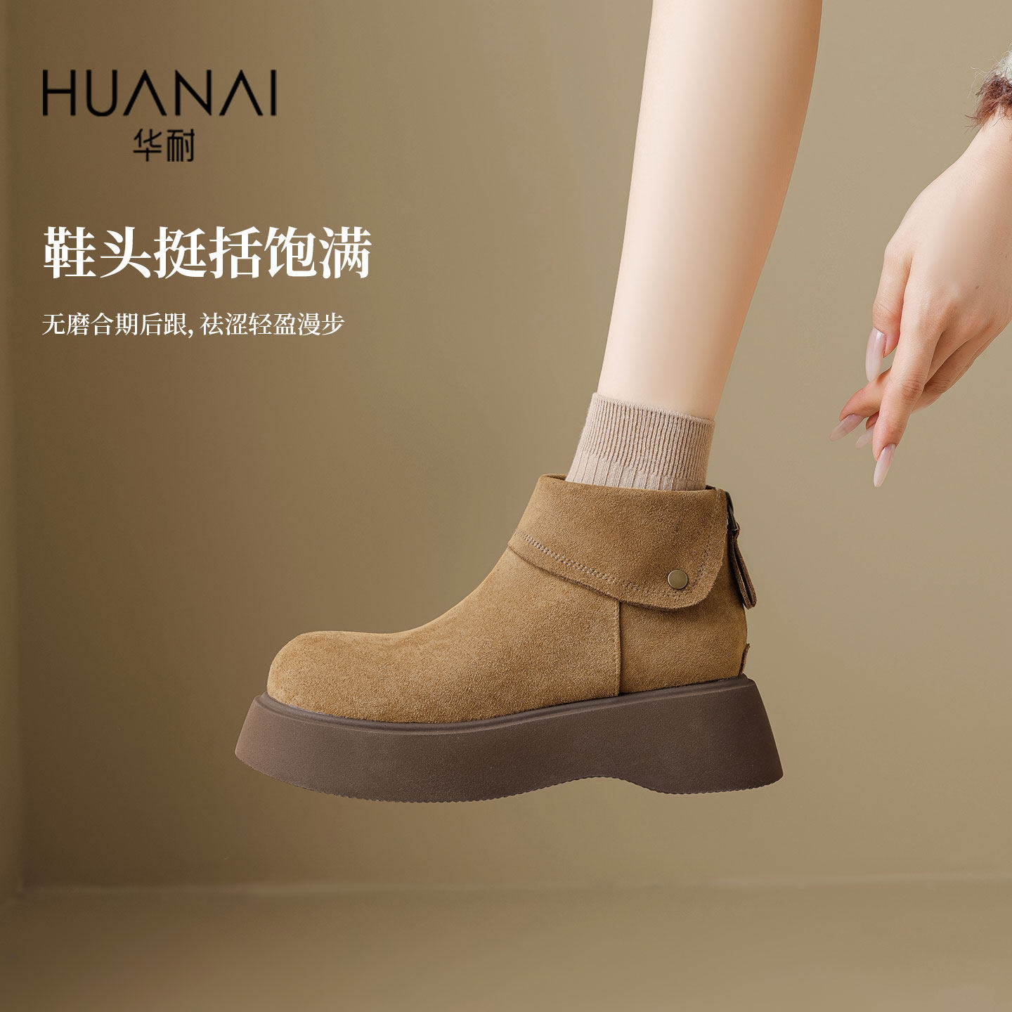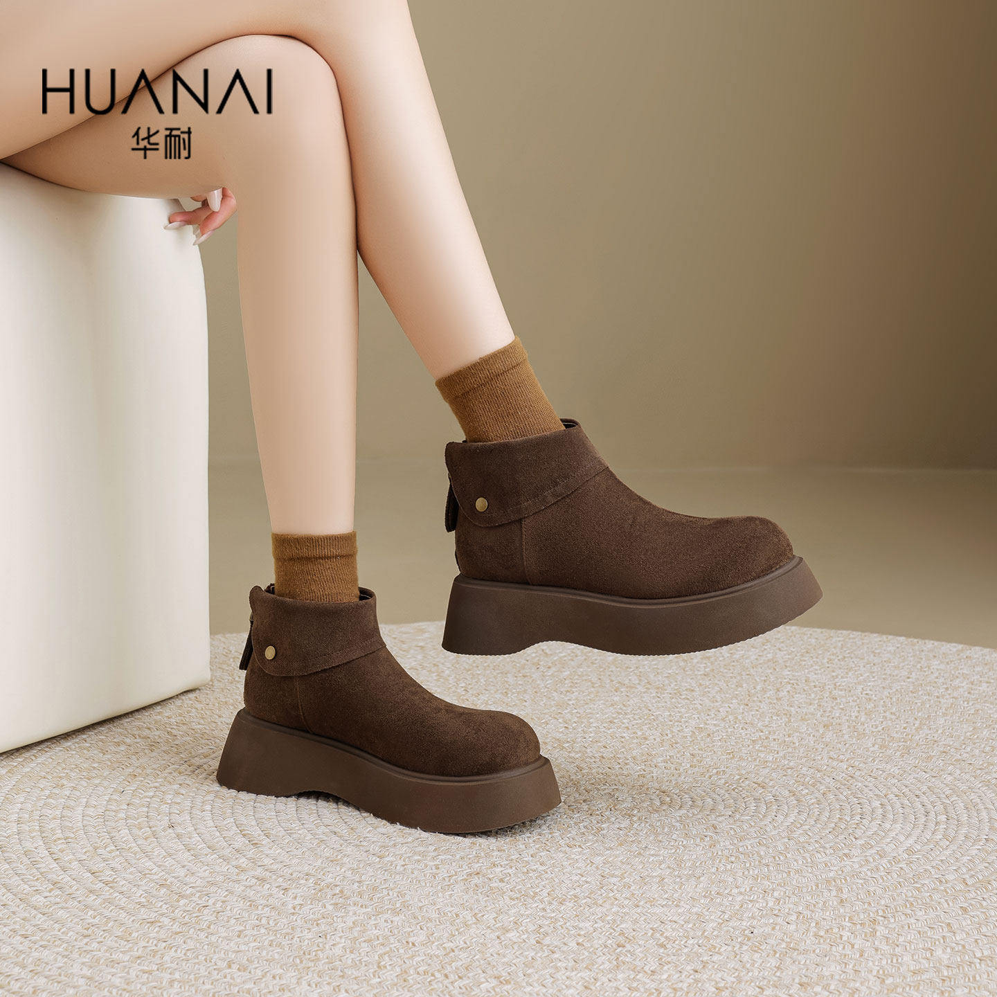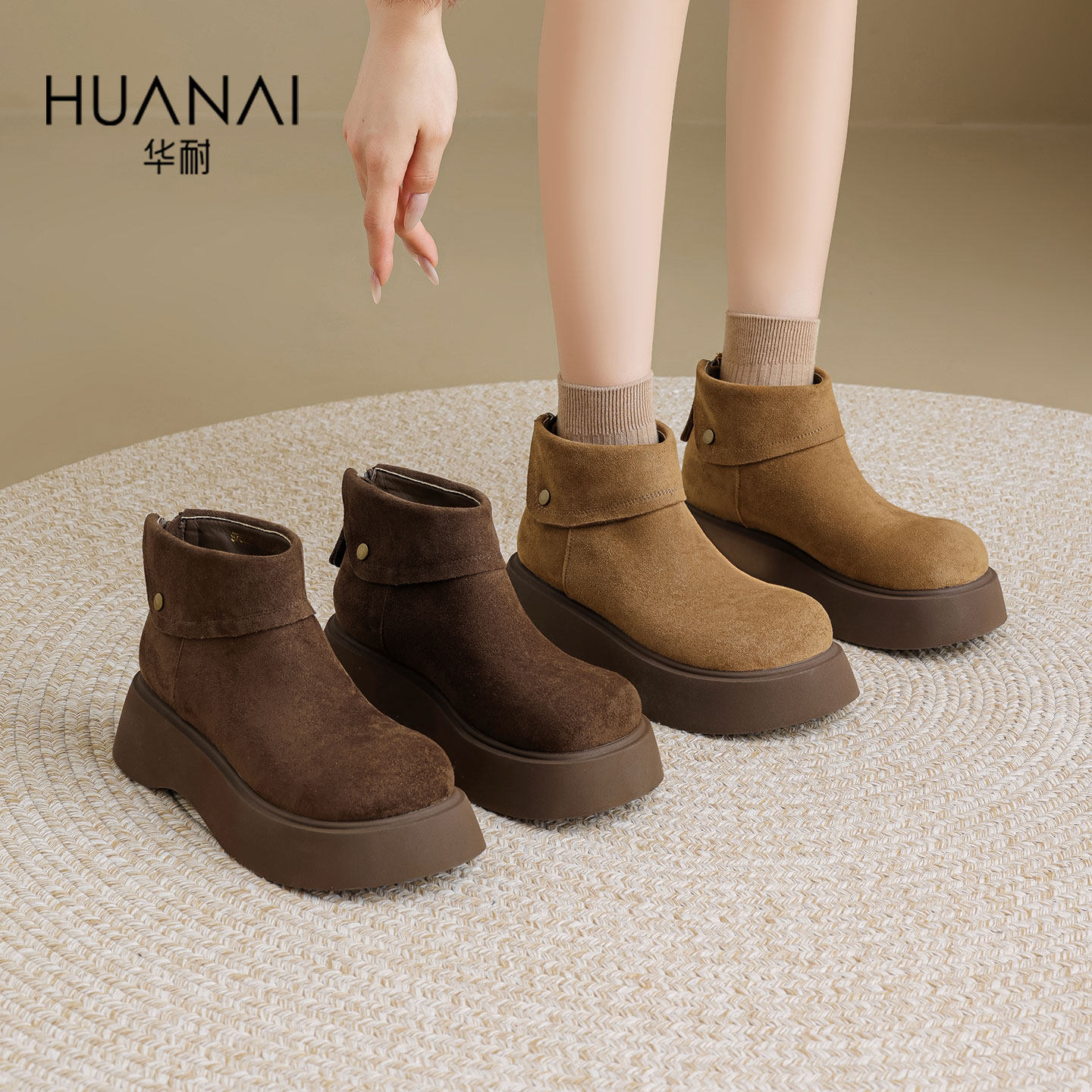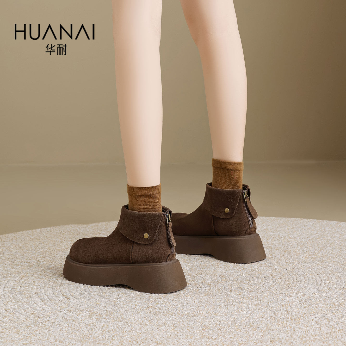 华耐厚底加绒短靴女2025秋冬新款圆头短筒复古勃肯鞋显瘦马丁靴女