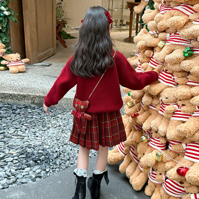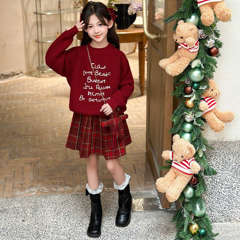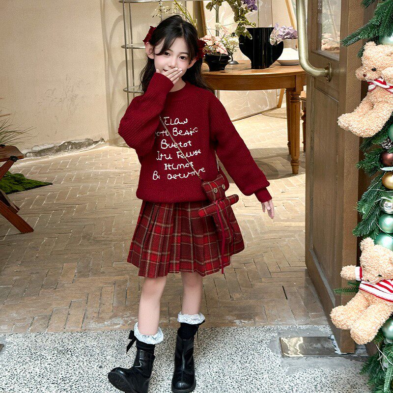 女童毛衣套装秋冬款洋气红色新年装拜年服连衣裙儿童百褶裙两件套