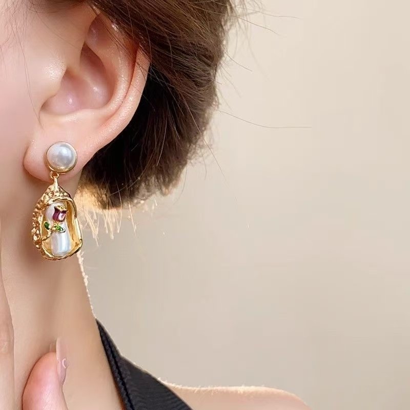 莫奈花园巴洛克珍珠耳环紫色油画风耳钉女小众复古金色耳饰流苏