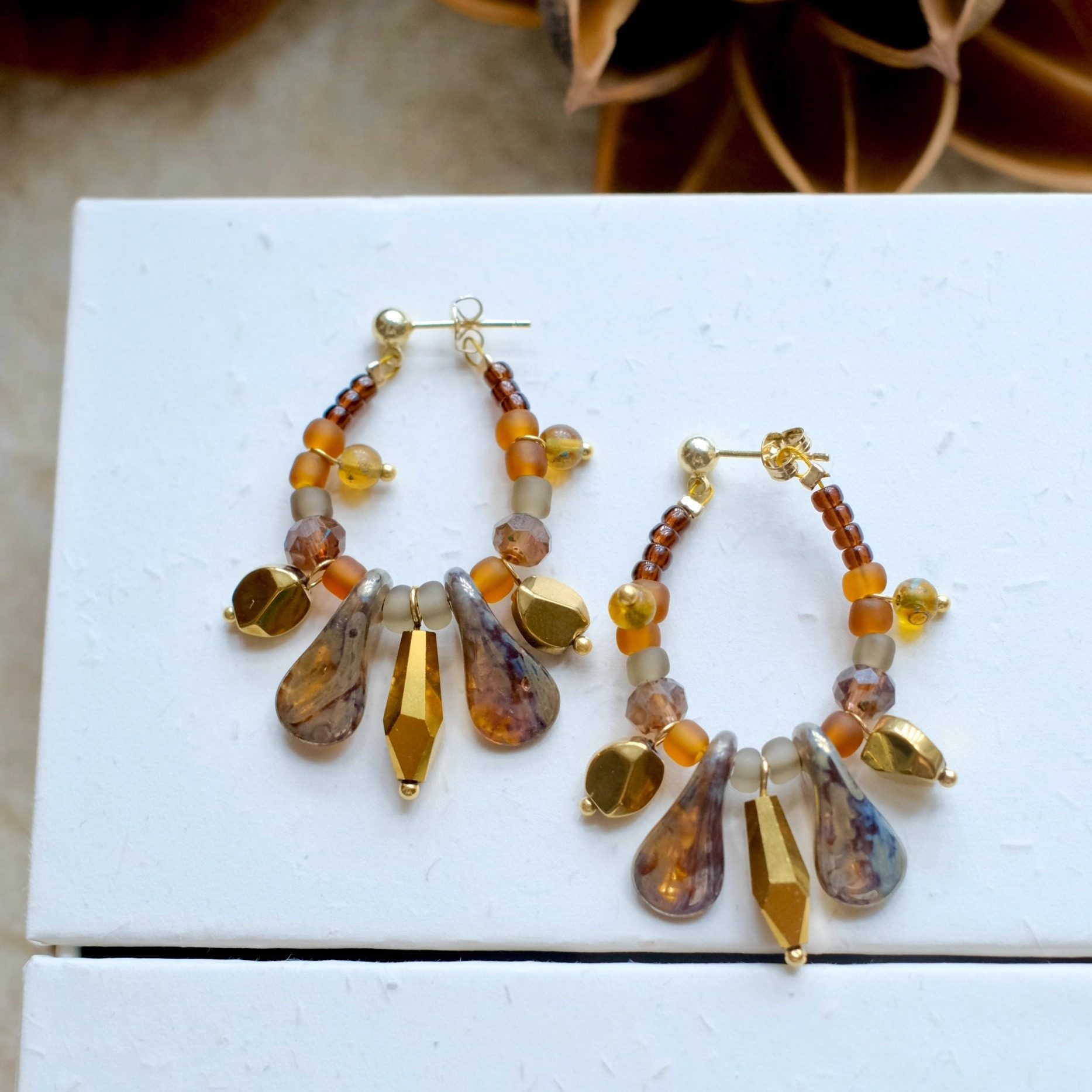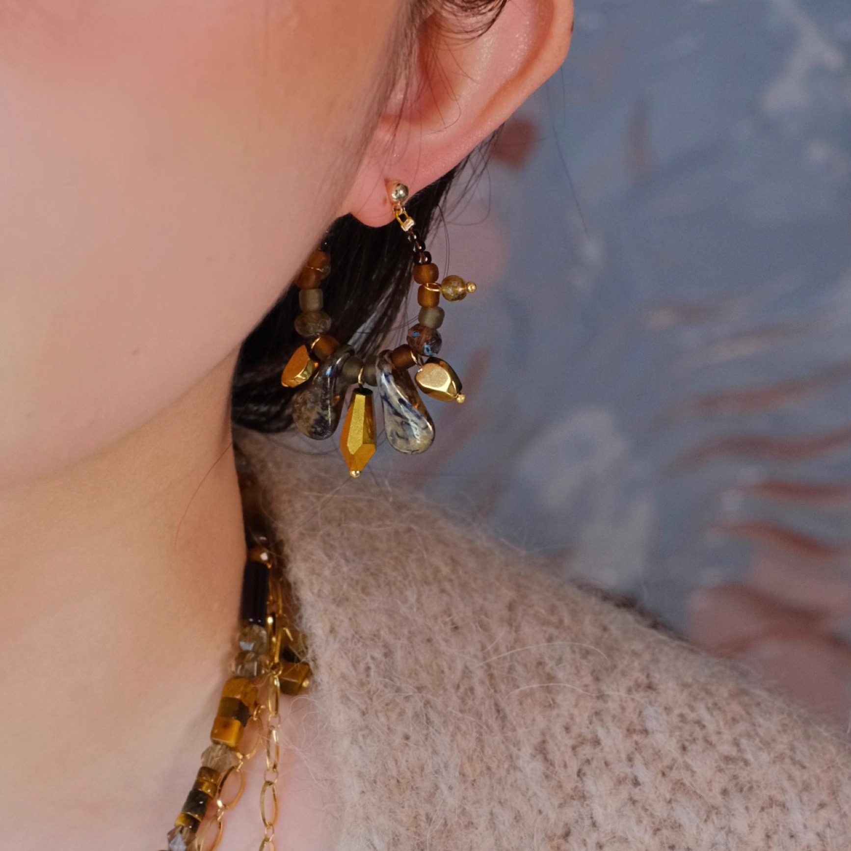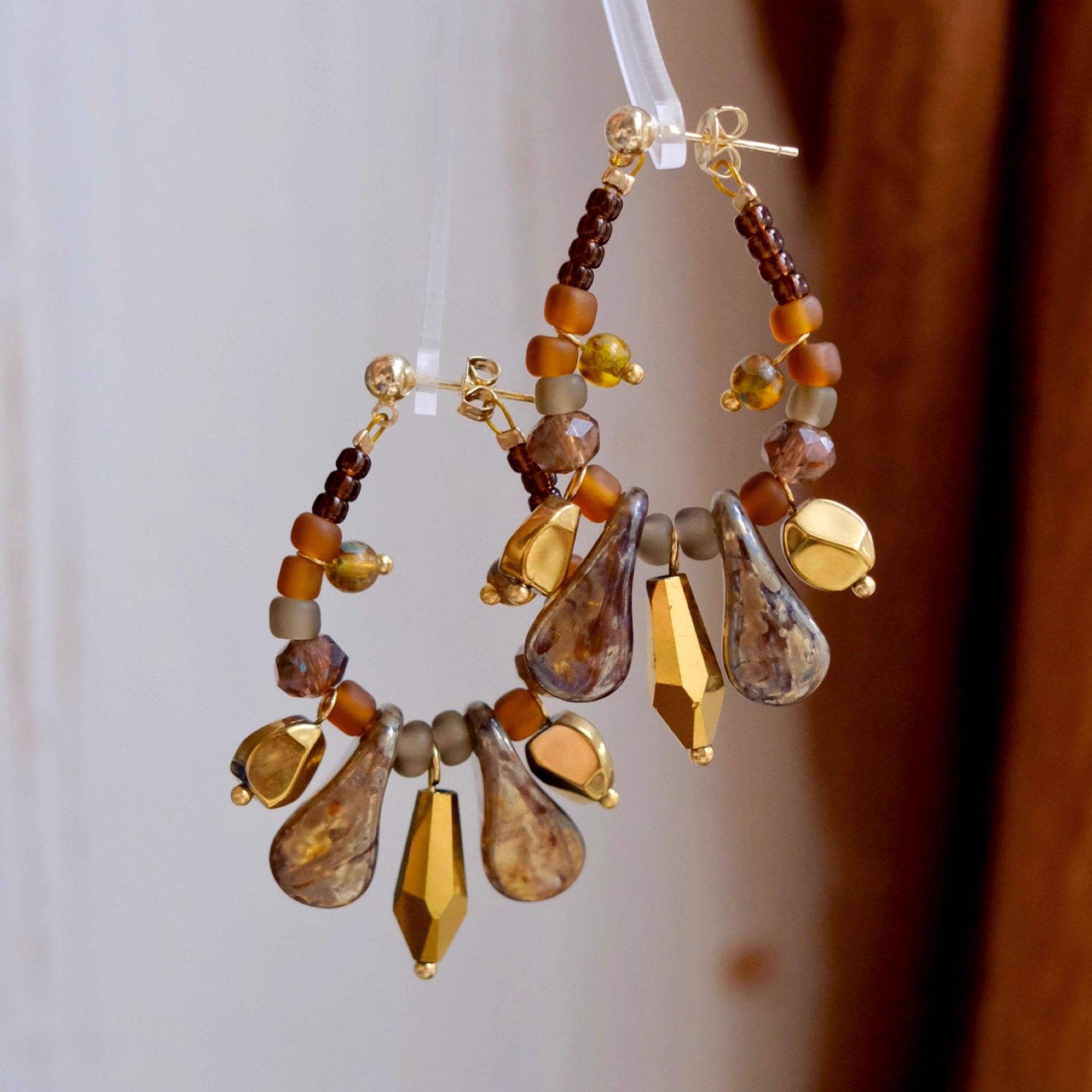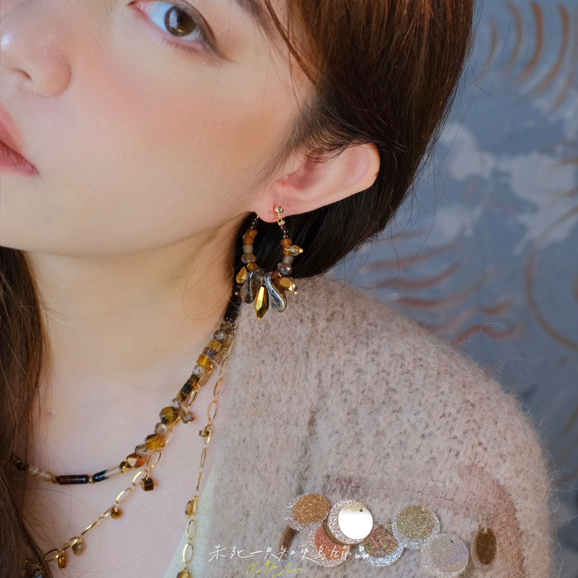 《硕果》原创小众复古文艺秋冬咖色琉璃串珠流苏圆圈耳环耳夹耳饰