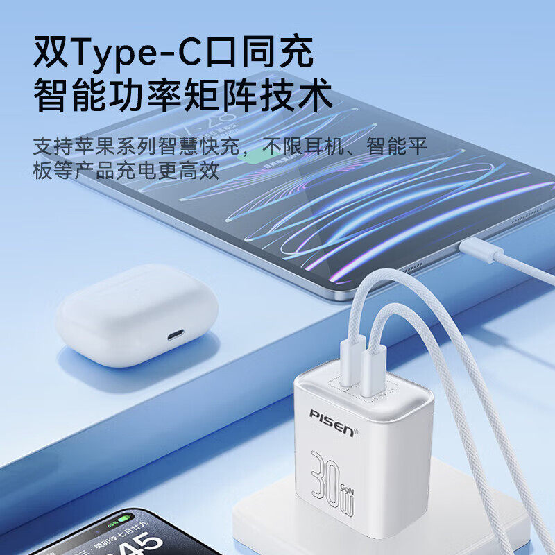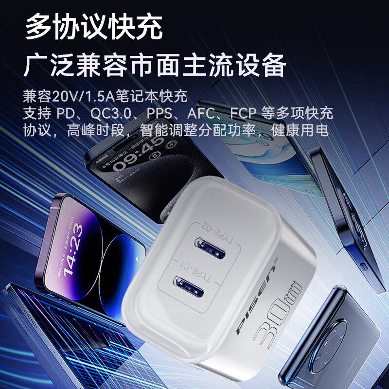 品胜30W氮化镓充电器双C口适用iPhone16苹果15充电头多口Type-C快充PD闪充华为小米三星手机iPad平板通用插头