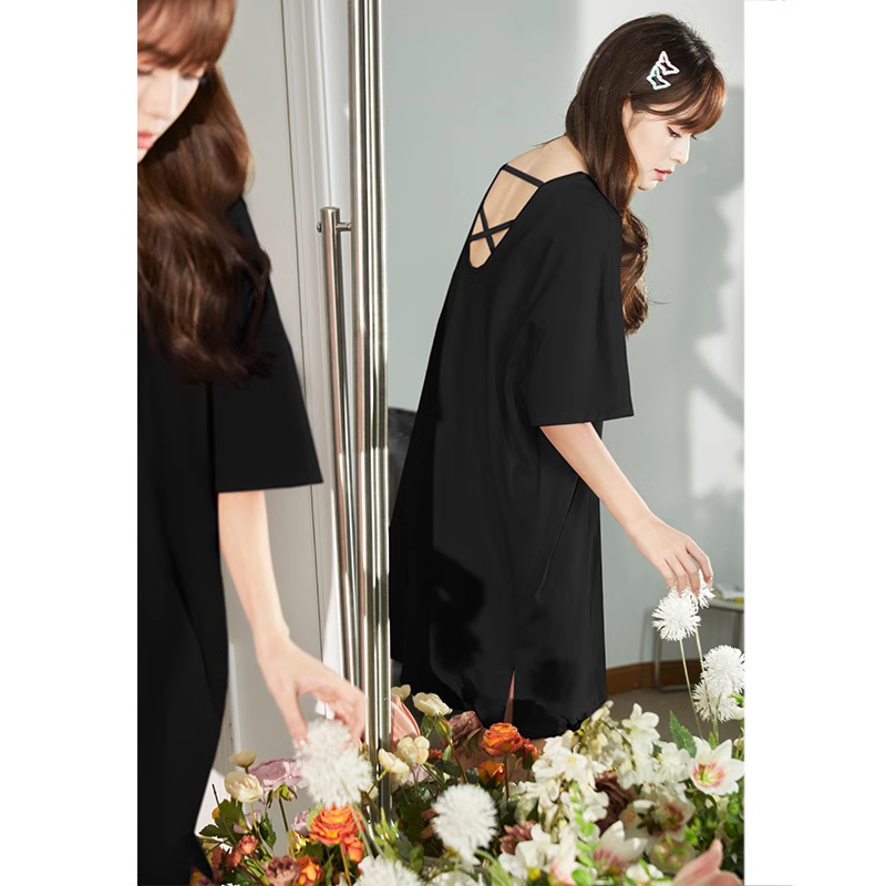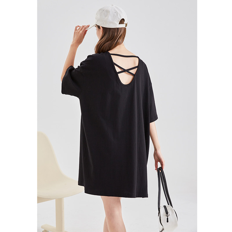 唐狮夏日多巴胺黑色连衣裙女装背绑带设计T恤连衣裙法式浪漫裙子