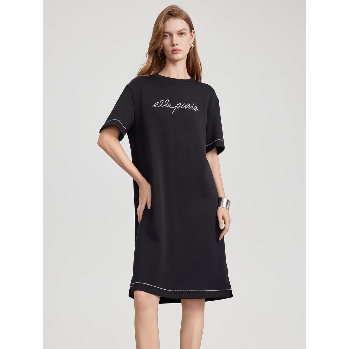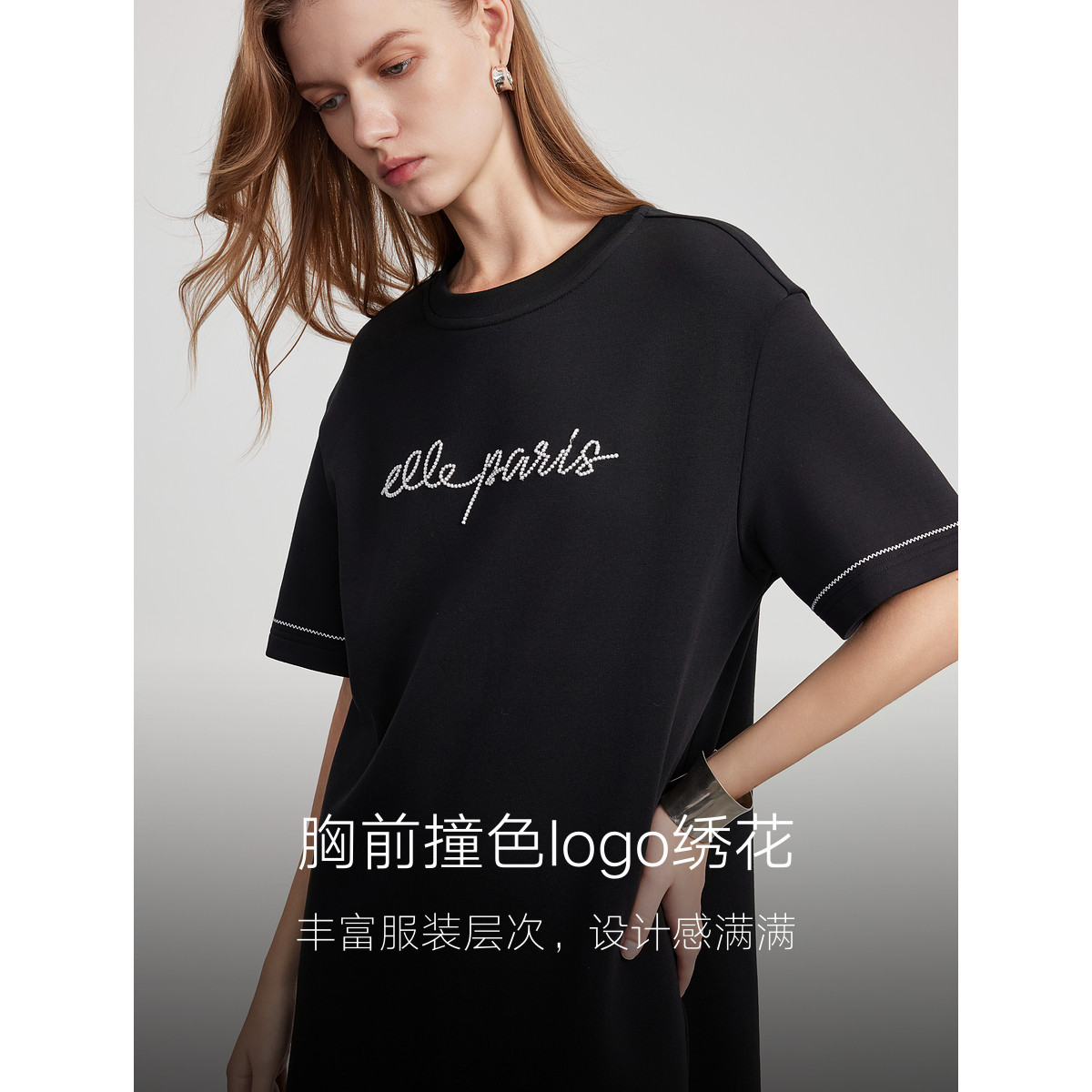 ELLE摩登莫代尔绣花连衣裙女2025夏季新款设计感宽松时髦T恤裙子