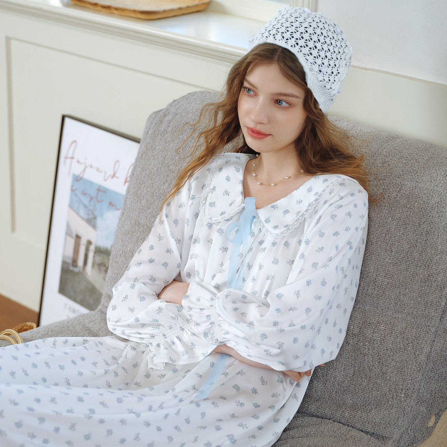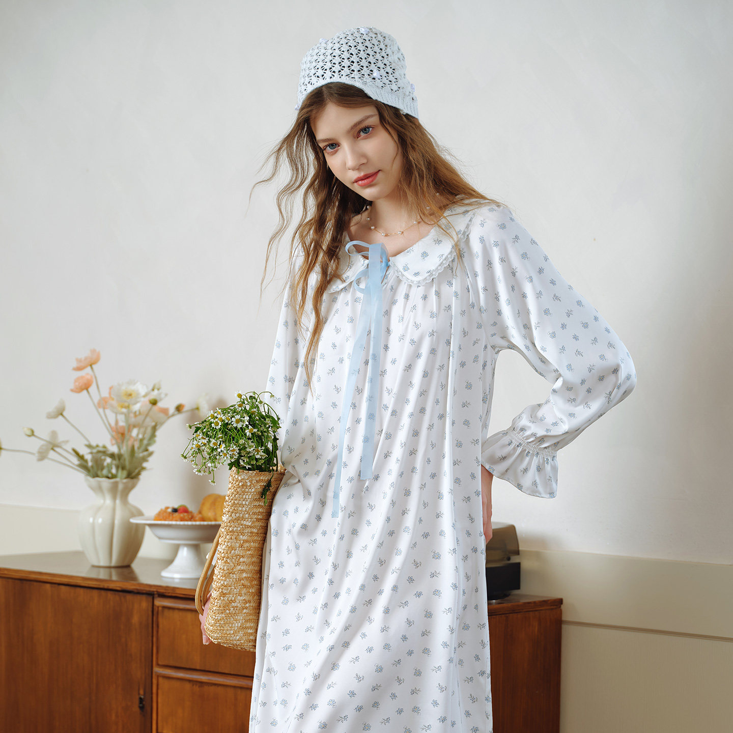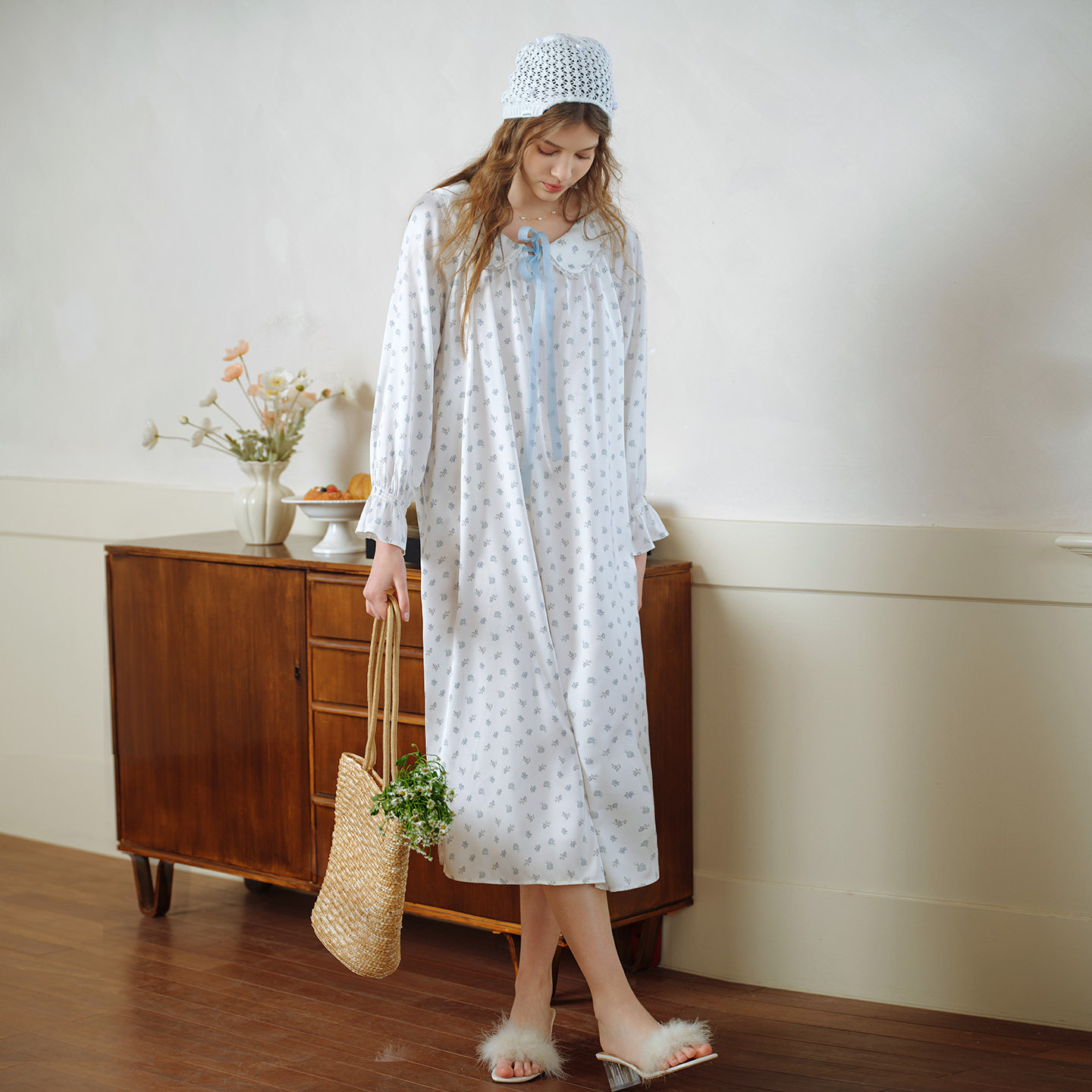 美标新款长袖睡裙女士春夏复古公主风甜美碎花可外穿蕾丝家居服秋