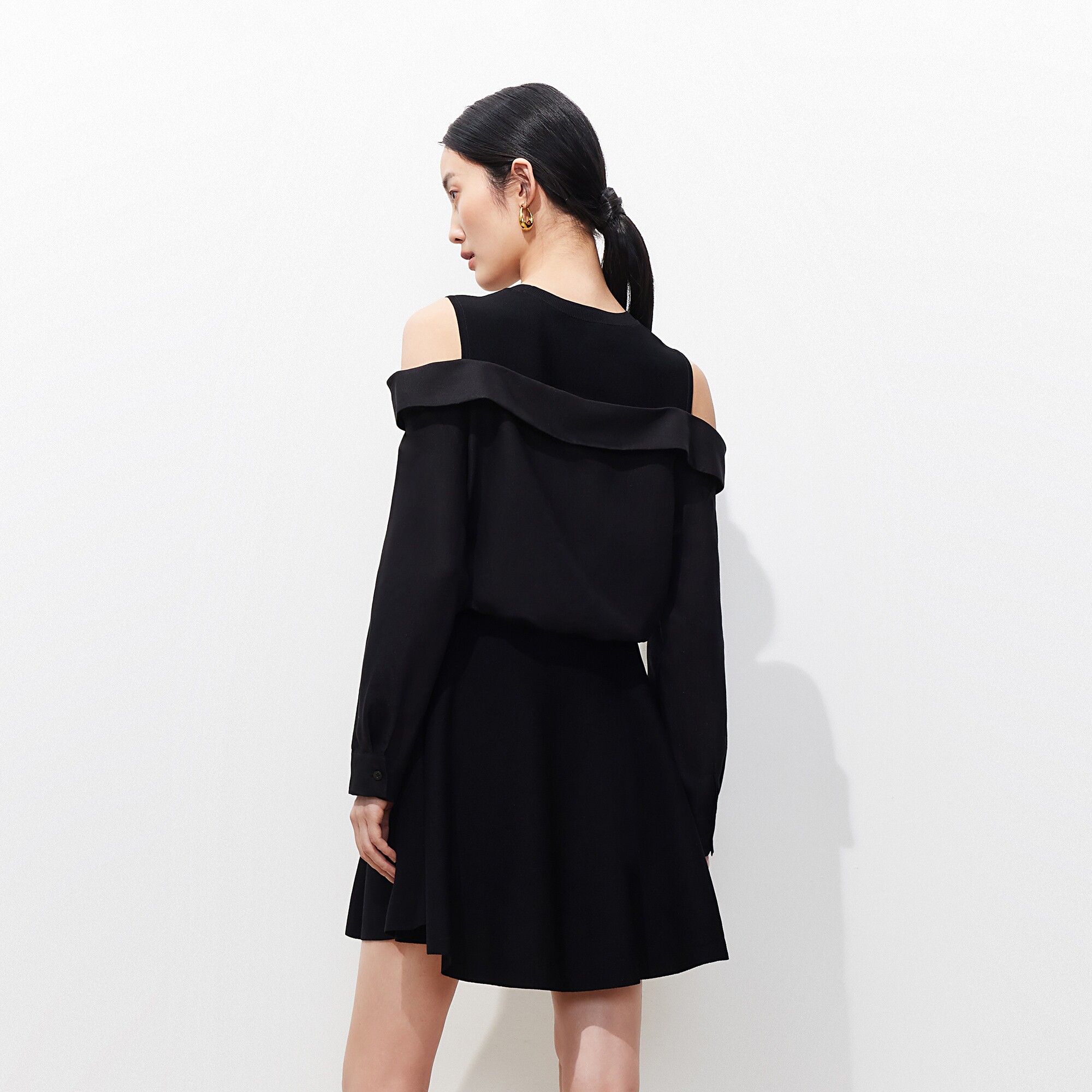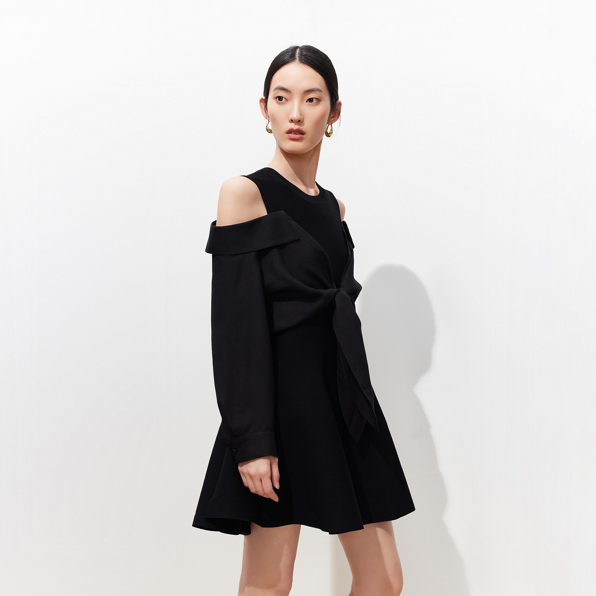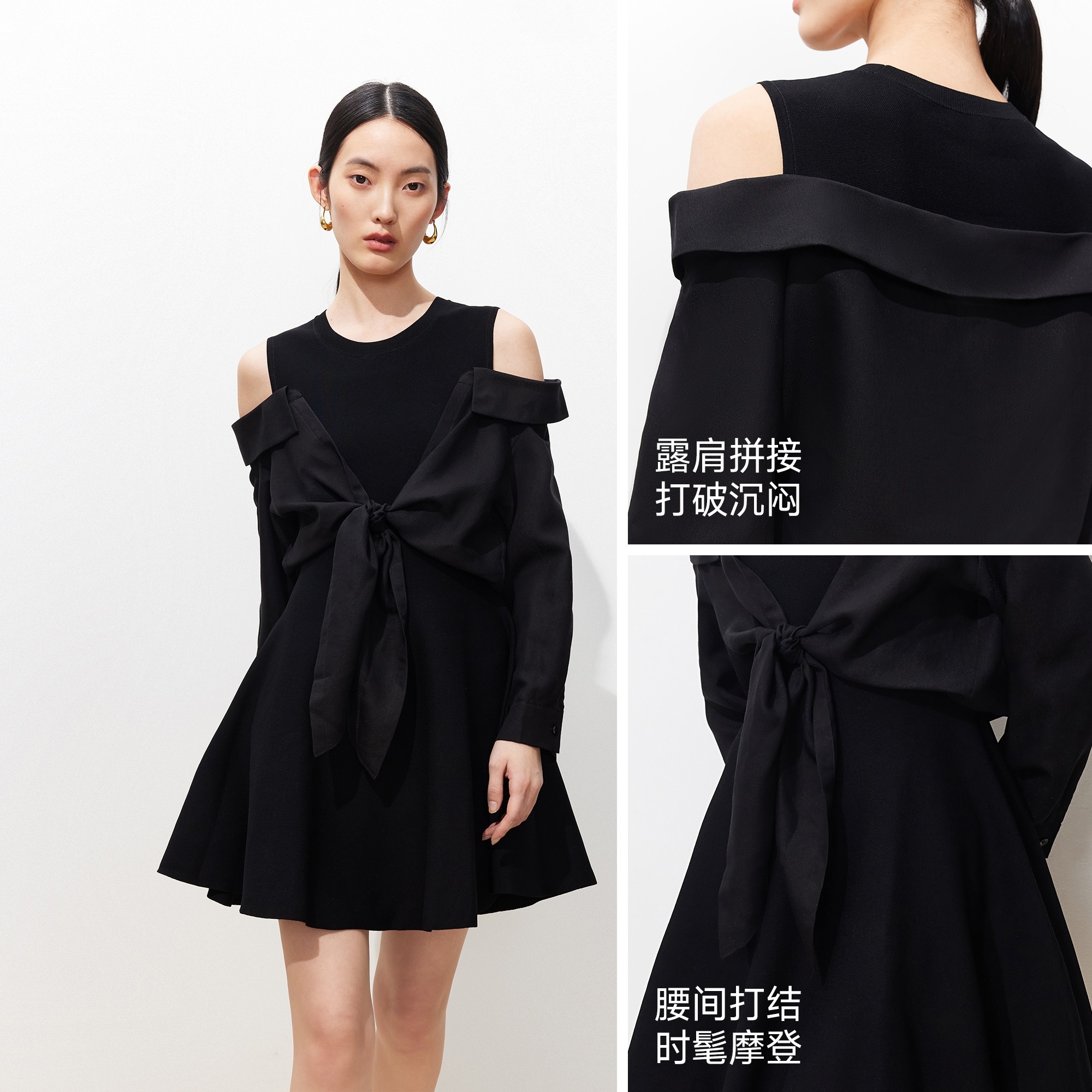 巧妙露肩拼接,腰间打结设计,时髦摩登