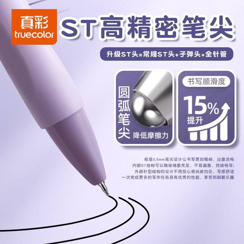 真彩文具按动中性笔st笔黑笔刷题笔速干顺滑高颜值笔芯黑色水笔小学生专用初中生碳素签字按压式圆珠笔大容量