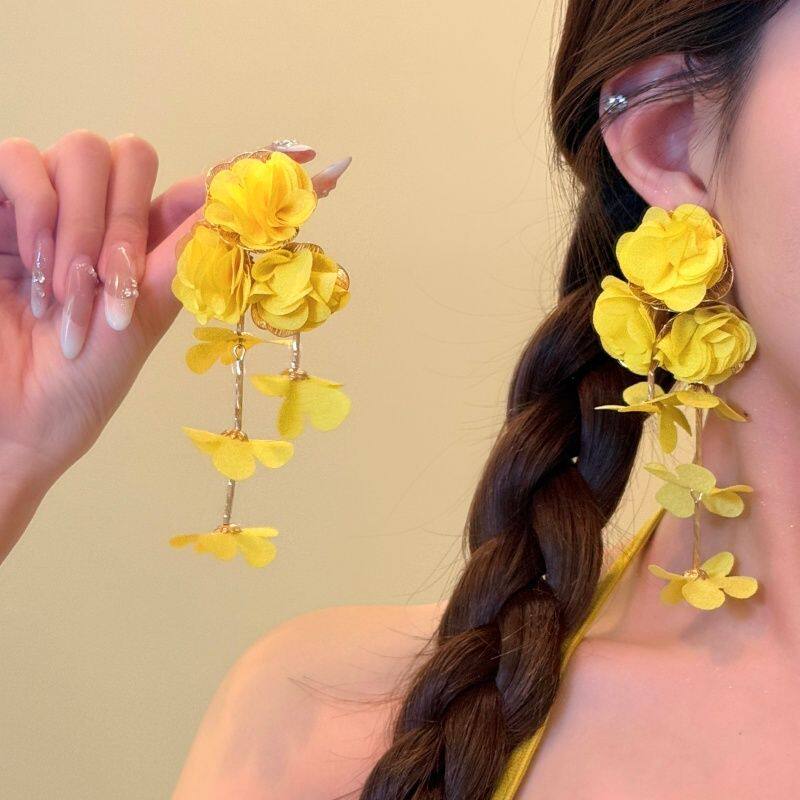 清酒山茶 粉色雪纺花朵流苏大耳环巨好看独特漂亮海边度假风耳饰