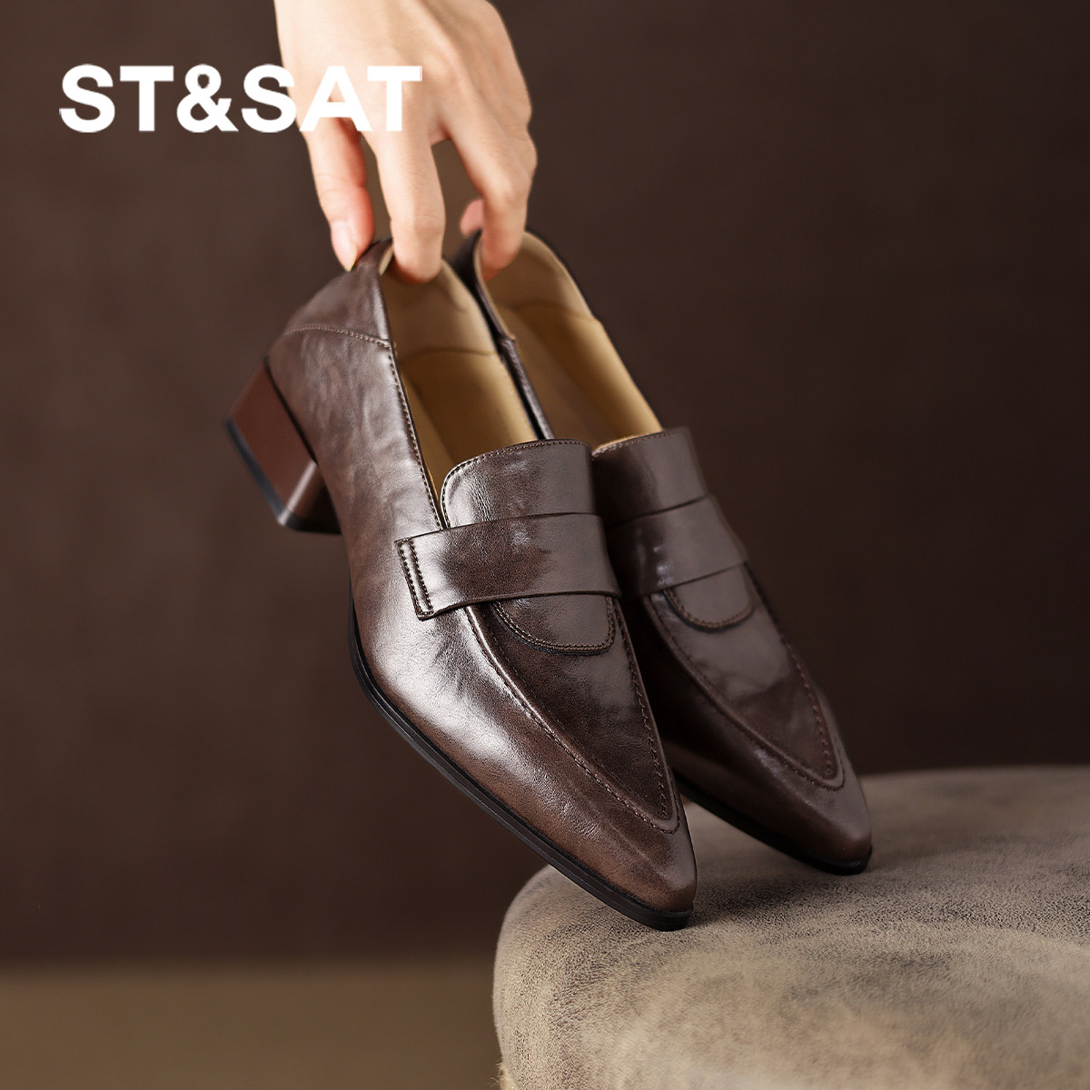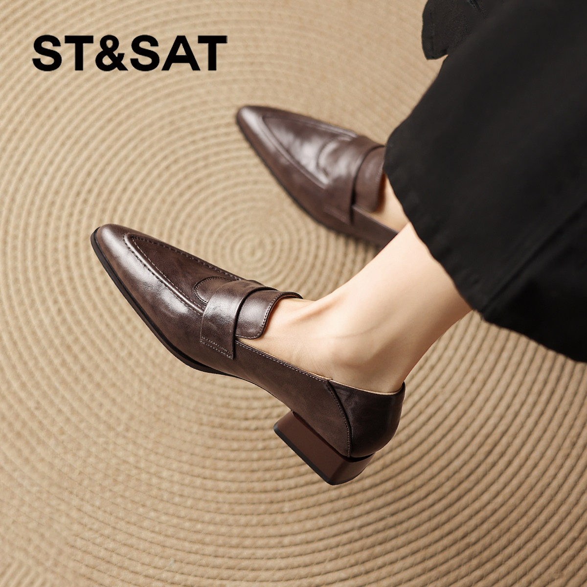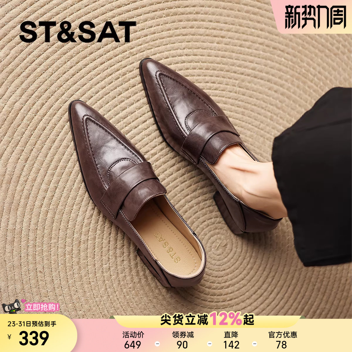 星期六尖头小皮鞋女2025新款秋冬季棕色乐福鞋英伦风粗跟法式单鞋