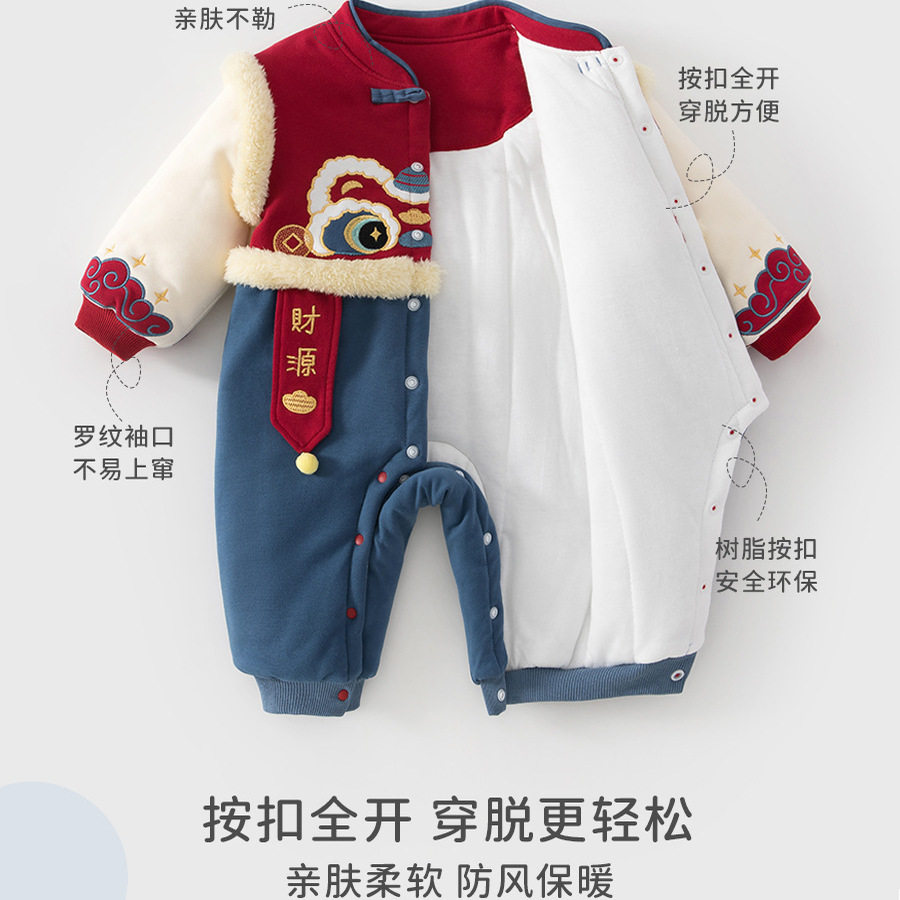 婧麒婴儿宝宝拜冬年服宝宝连体衣哈衣夹棉保暖新年外出爬爬服冬装