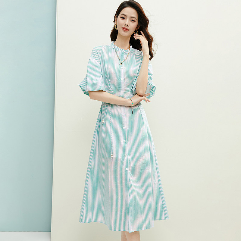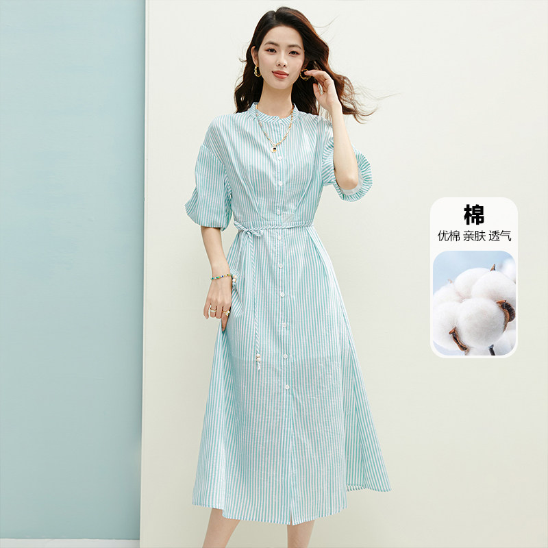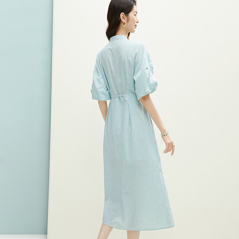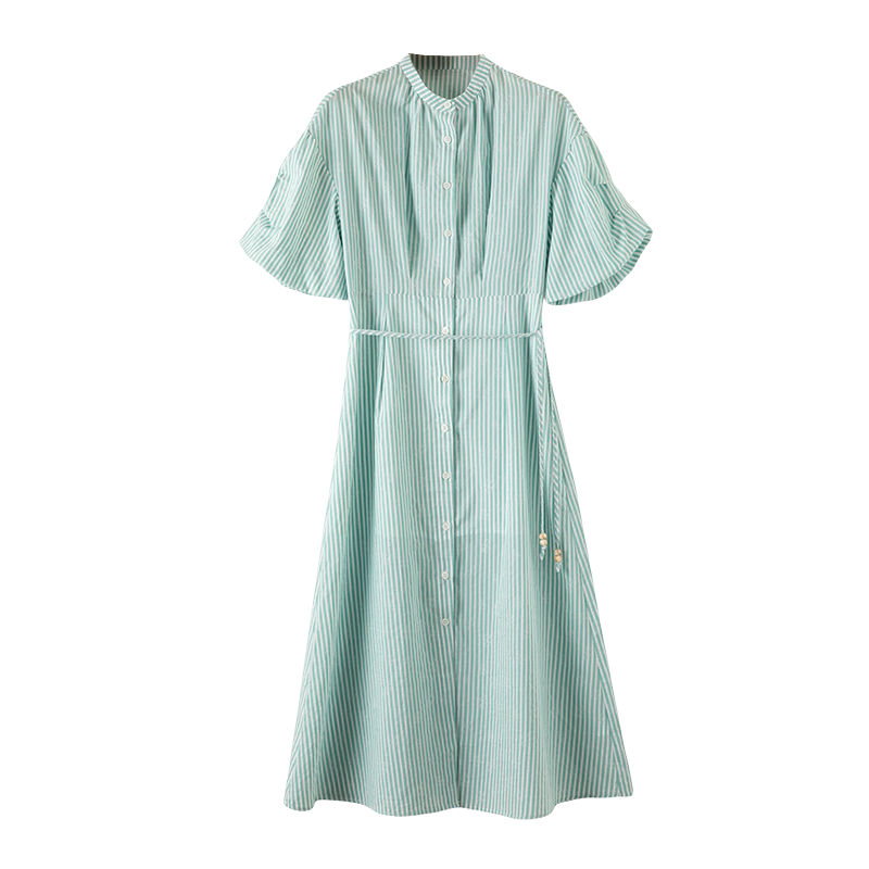 晚白2026年春夏新款时尚立领条纹棉感裙子莱赛尔系带收腰连衣裙