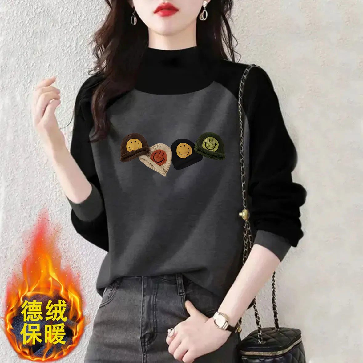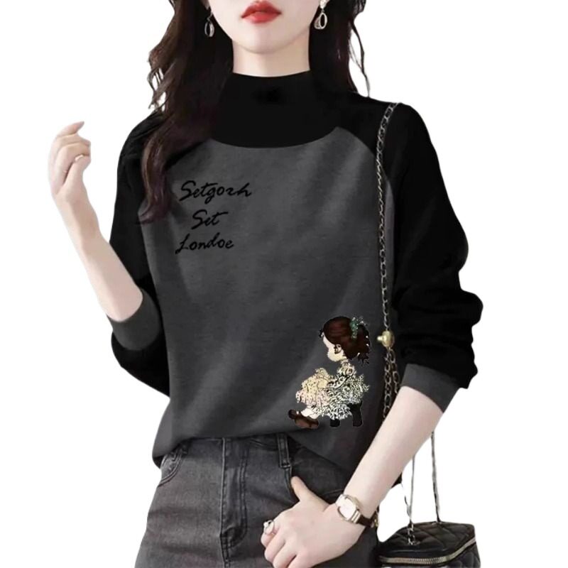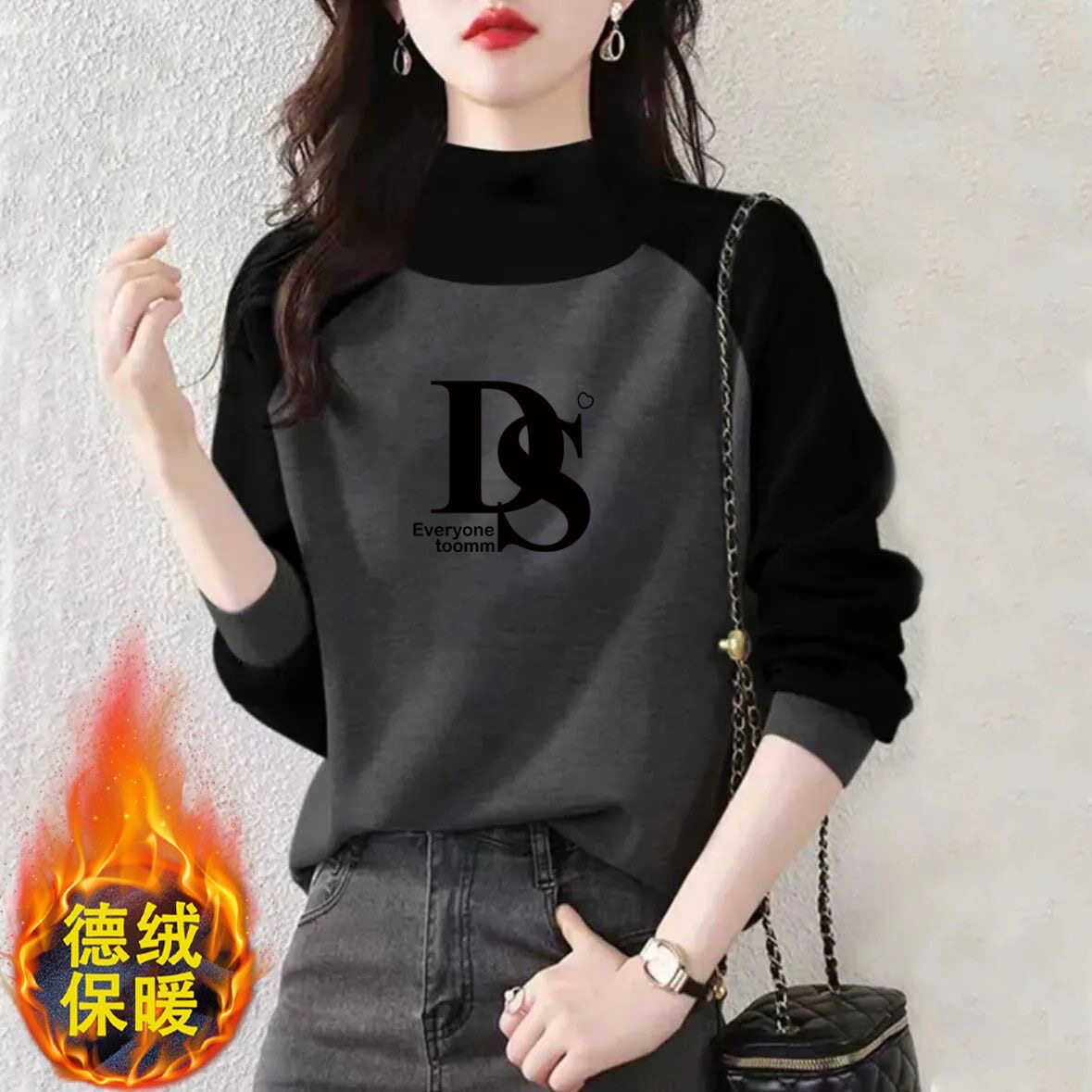 德绒打底衫插肩袖拼色长袖t恤女秋冬ins新款保暖打底衫大码上衣