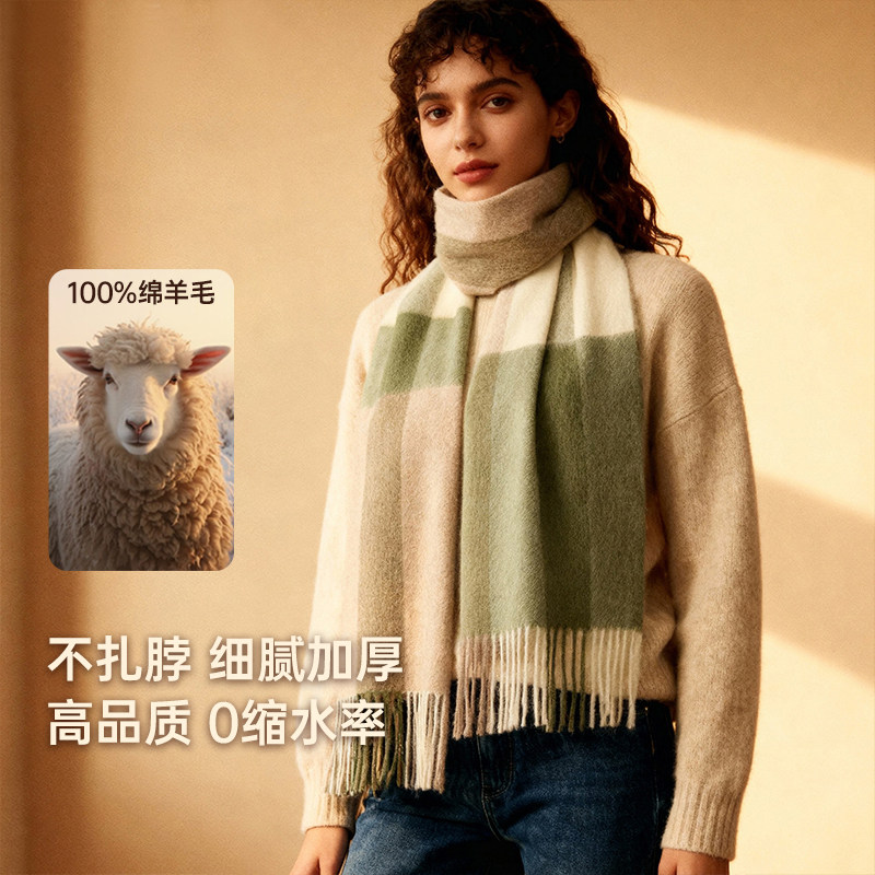 JESSIEJANE羊毛围巾女冬季韩版绿色格子秋冬披肩两用加厚保暖围脖
