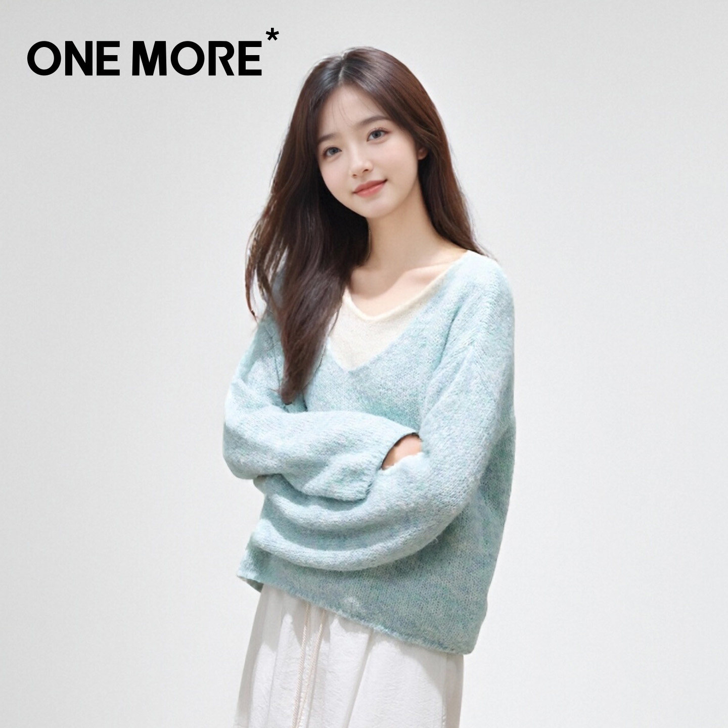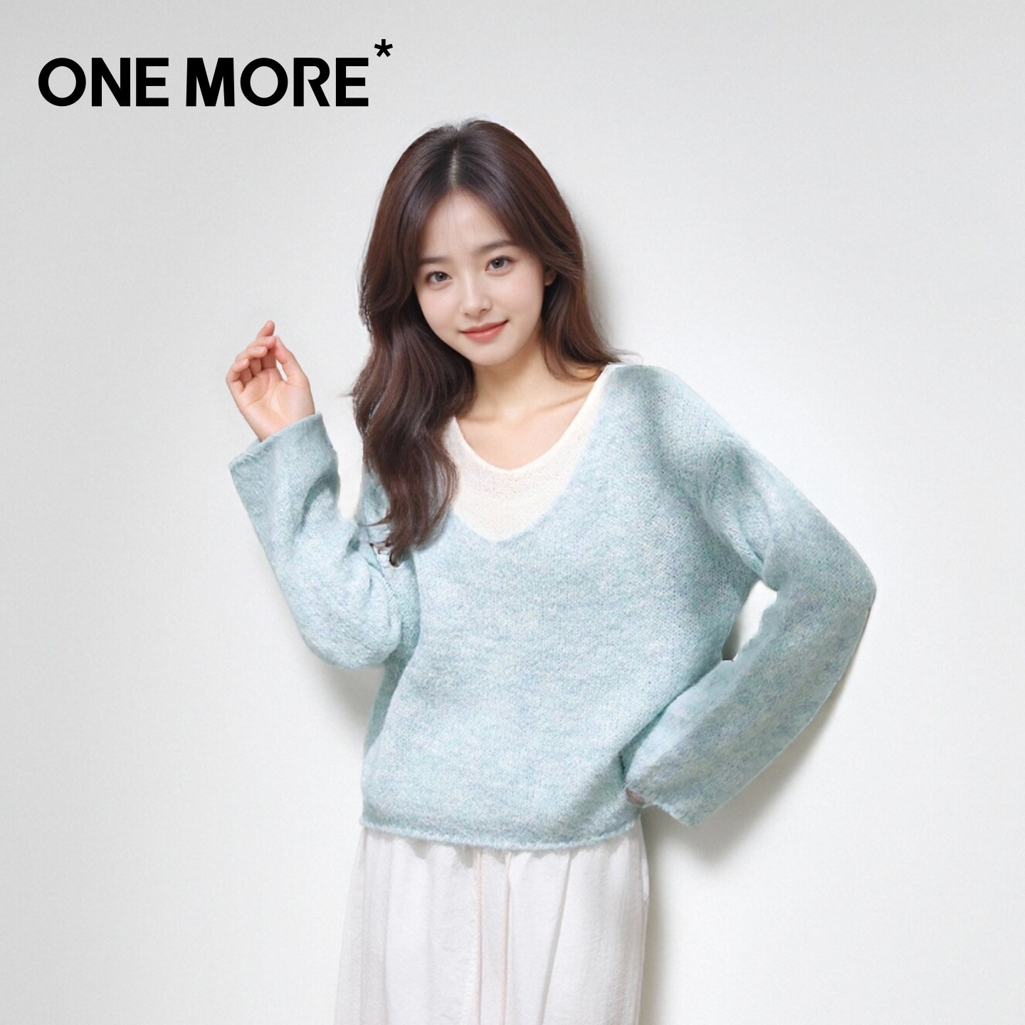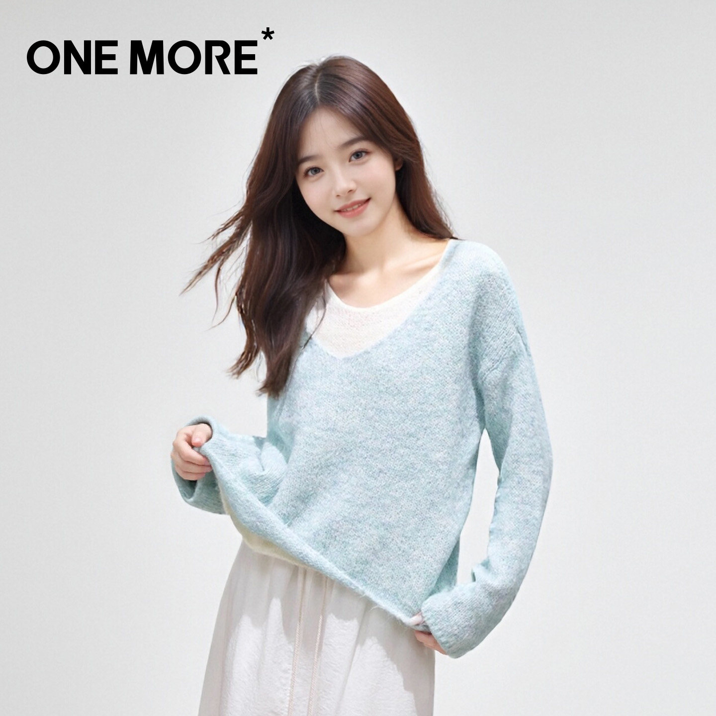 one more蓝色针织衫女2026新款春季慵懒风V领假两件百搭软糯毛衣