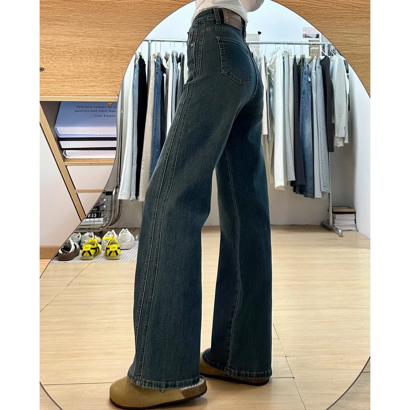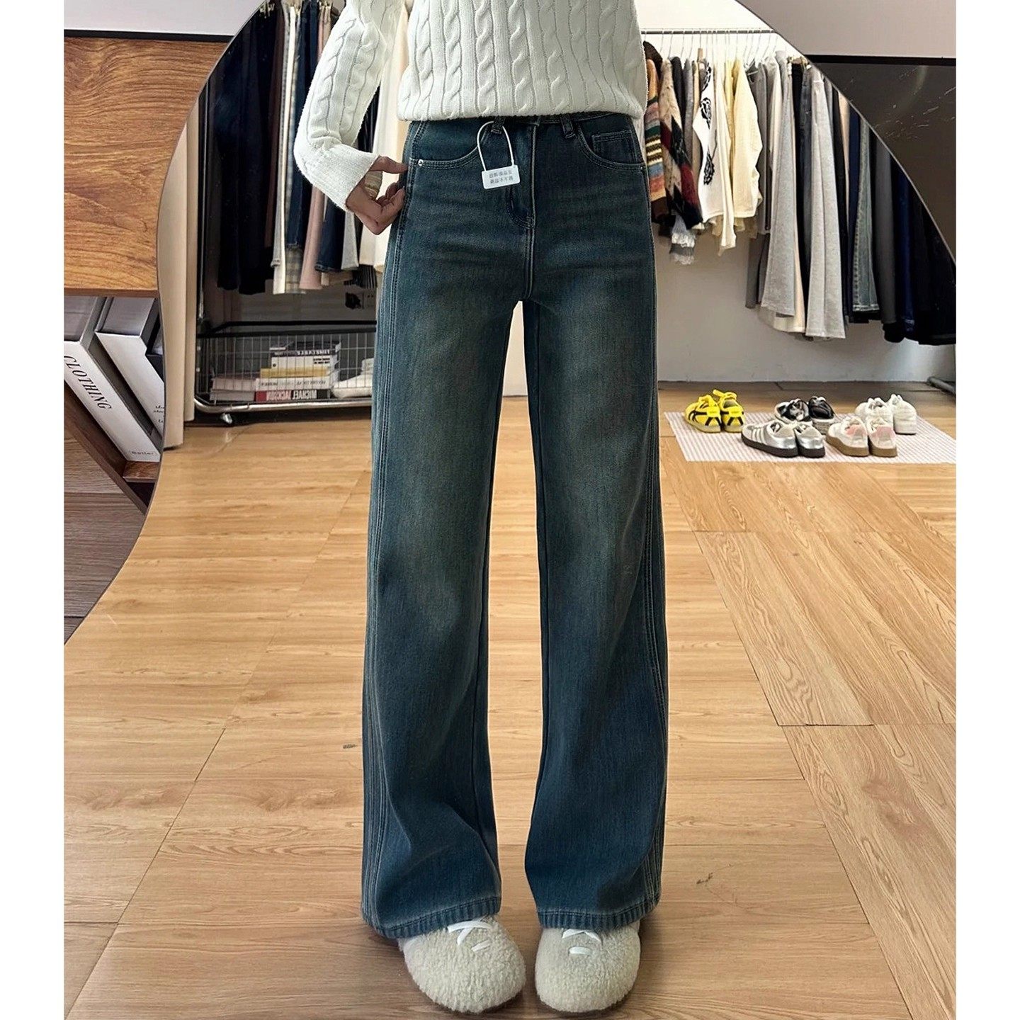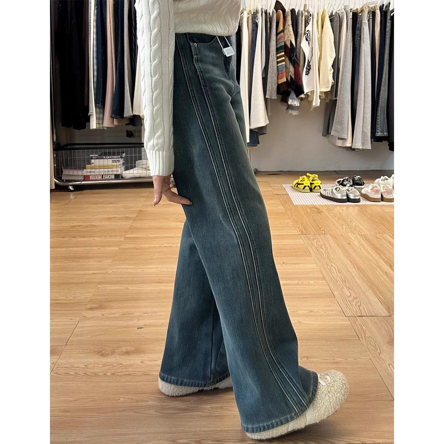 店主 自留款推荐~浅色加绒窄版直筒牛仔裤女秋冬宽松高腰阔腿裤
