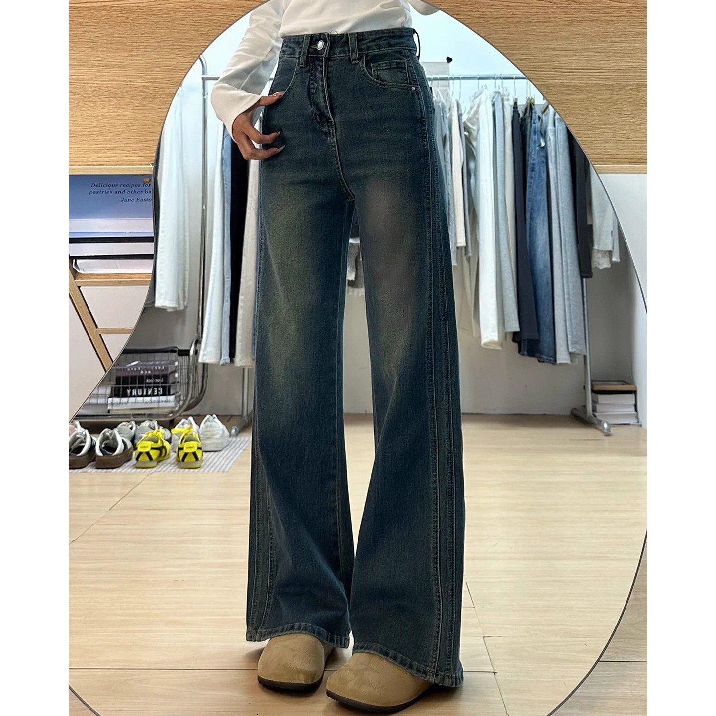王家有鱼秋季新款2025复古蓝微喇牛仔裤中高腰不贴腿显瘦裤子女款