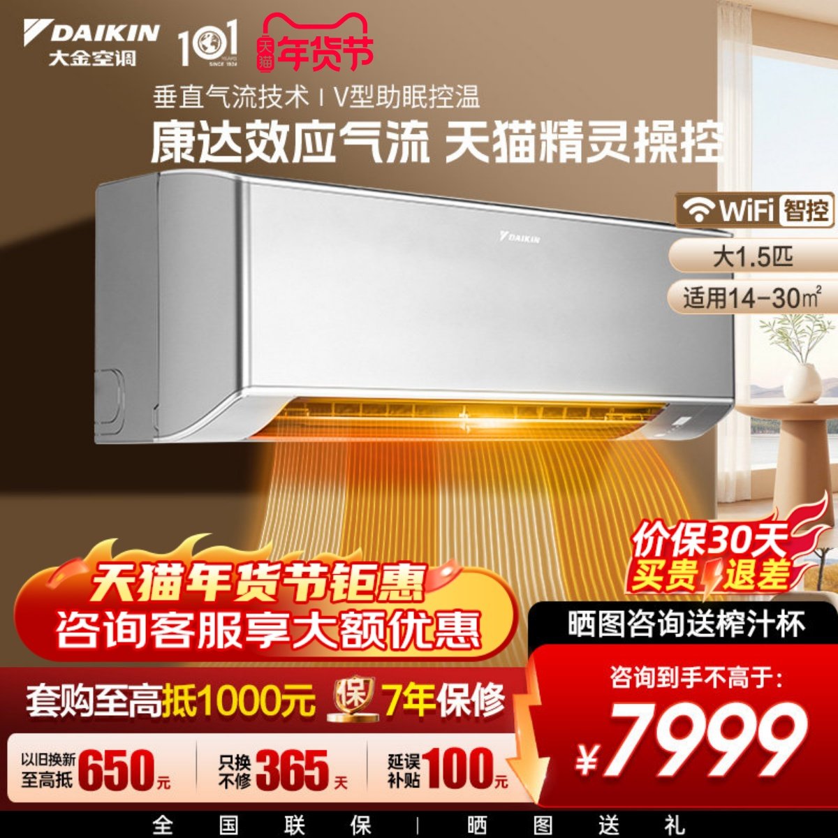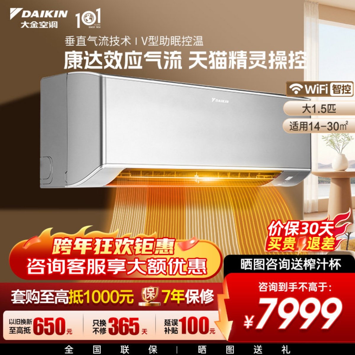大金空调1级变频大1.5匹自清洁WIFI静音挂机W136新款零境灰色