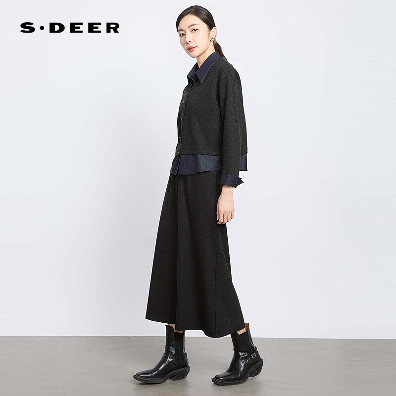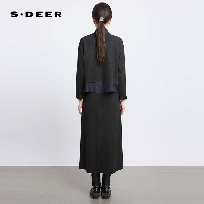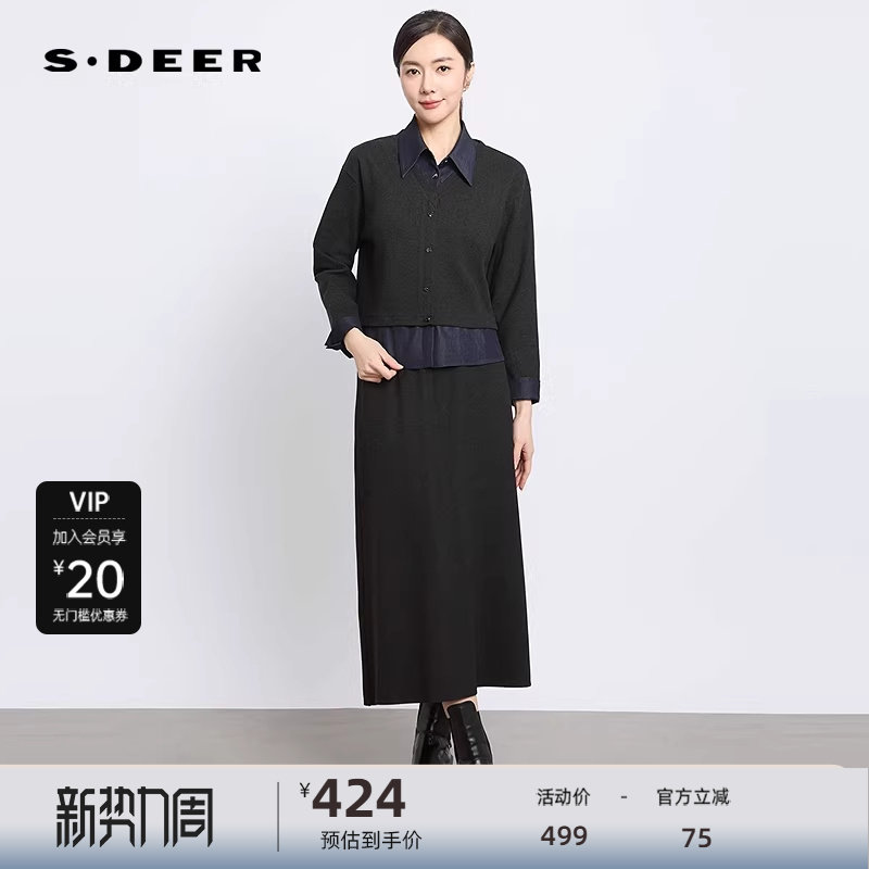sdeer圣迪奥女装25年新品OL风翻领撞色针织上衣长裙套装S251Z1401