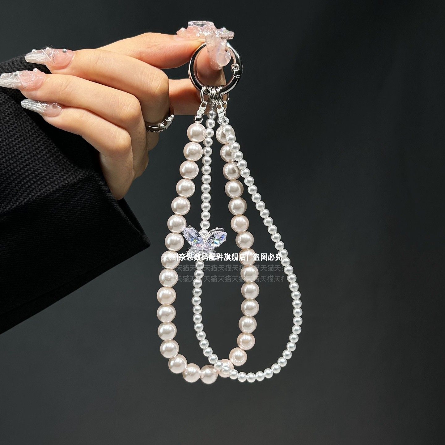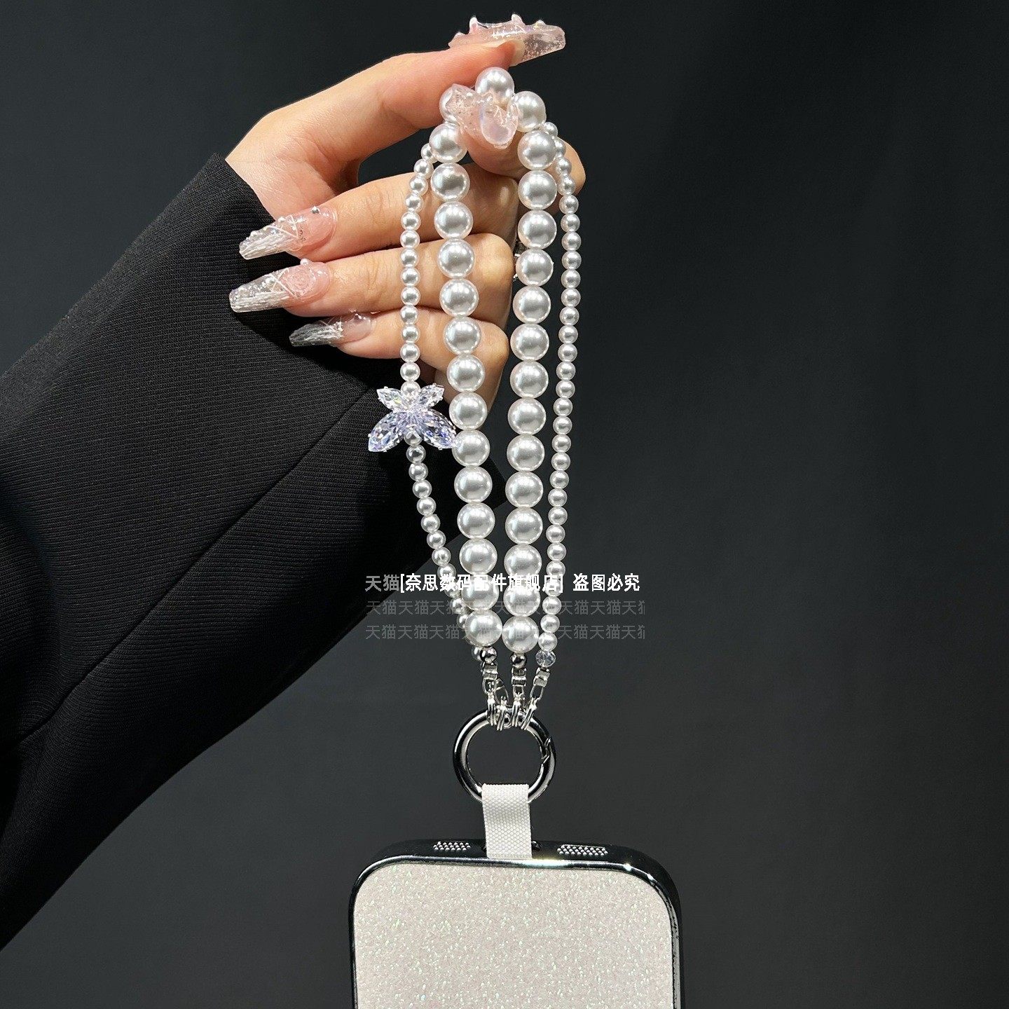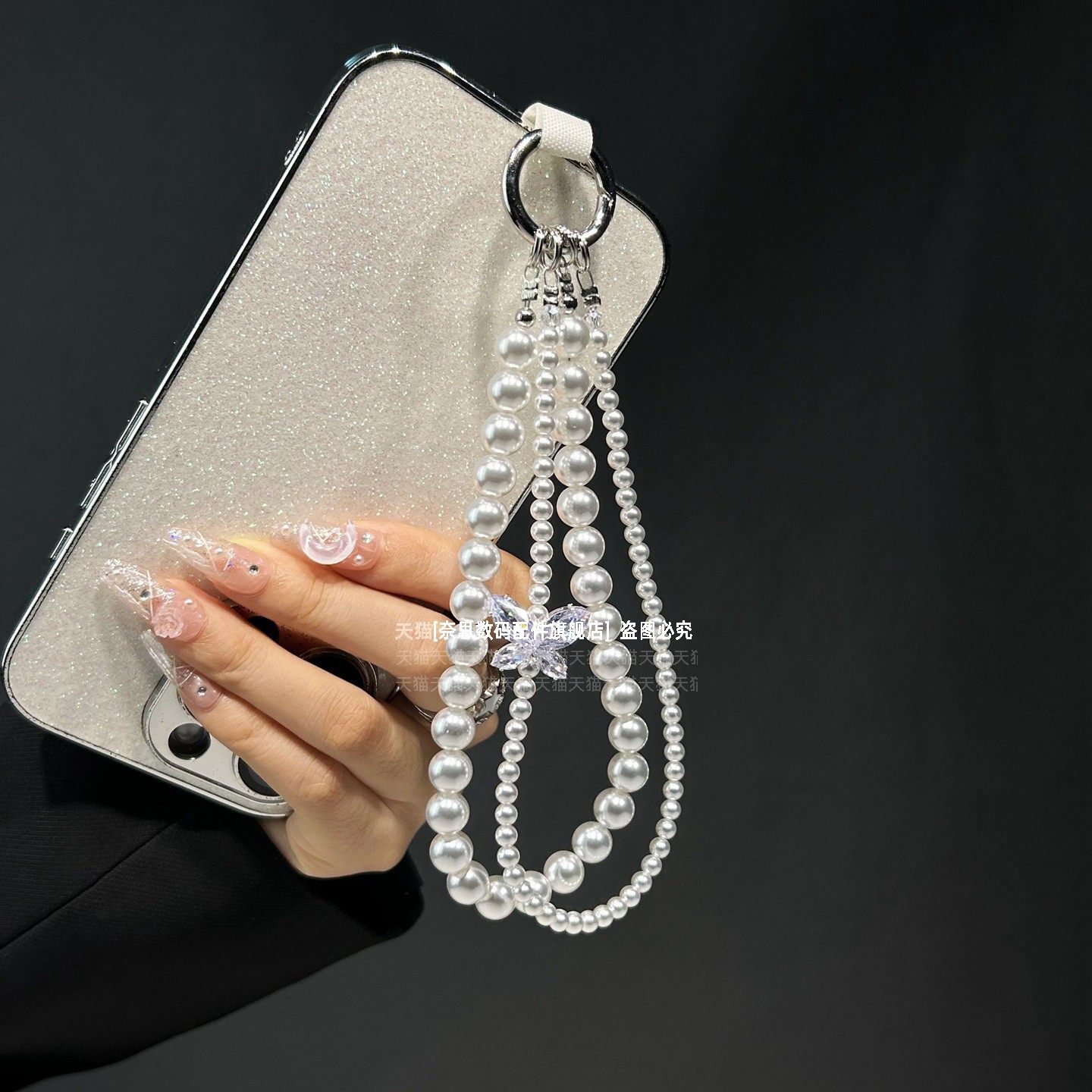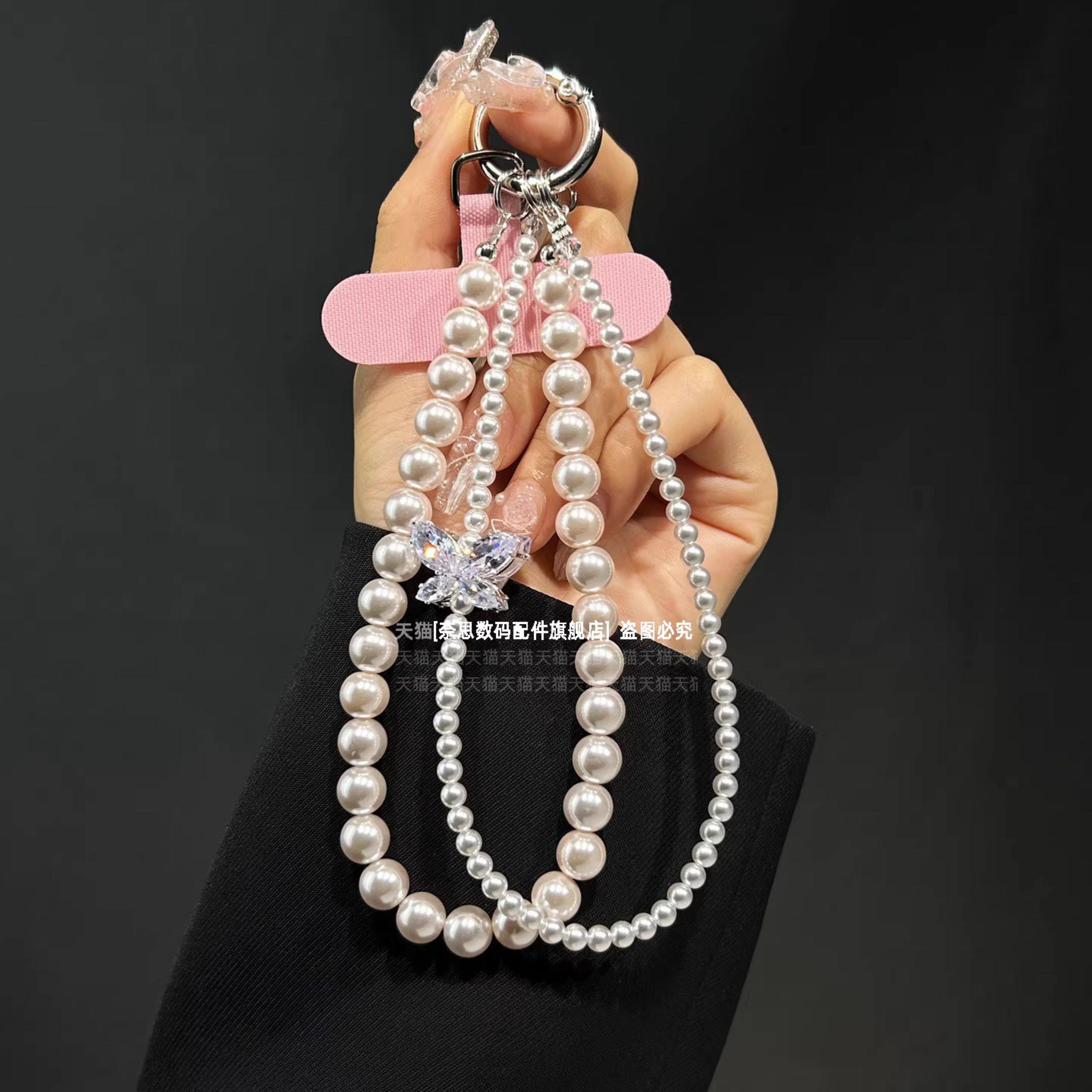 极光珍珠双层手机链绳轻奢水钻蝴蝶串珠挂链手腕防丢链条防摔腕带手链小众设计高端包包时尚挂饰挂件女垫片壳