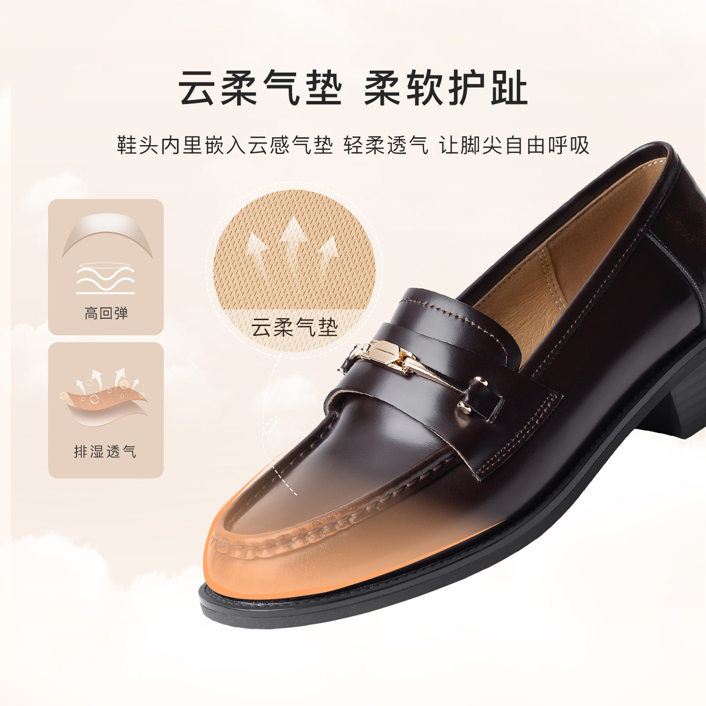 羊皮~棕色山茶花乐福鞋女2025新款通勤粗跟单鞋百搭英伦风小皮鞋