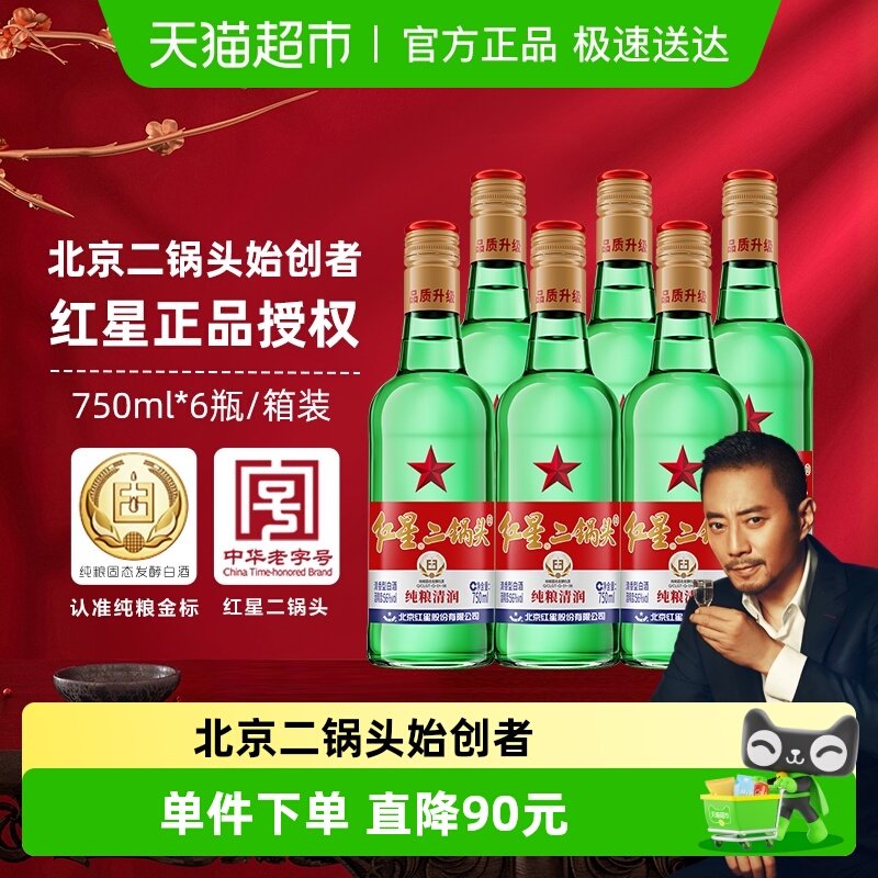 红星二锅头大二绿瓶56度750ml*6瓶整箱装清香型白酒纯粮口粮酒