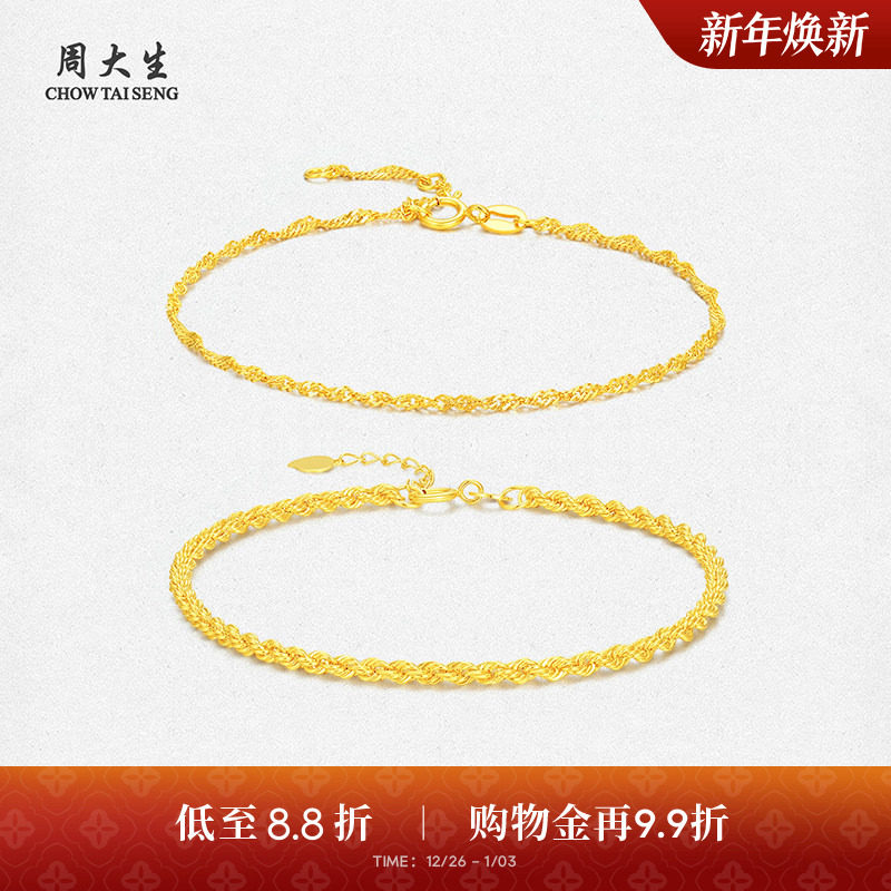 周大生黄18K金手链ins简约水波纹麻花链叠戴素链细链新年礼物