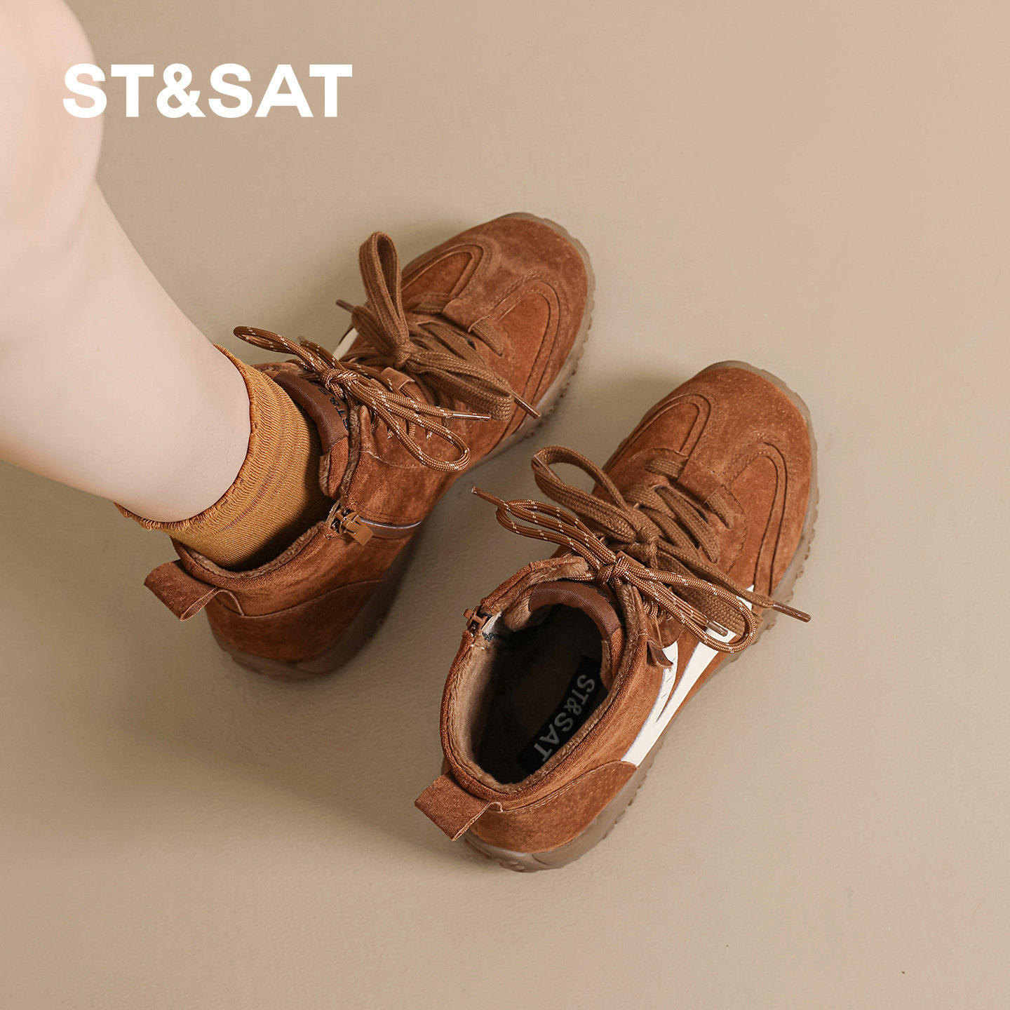星期六复古靴子女款秋冬新款真皮加绒保暖雪地靴潮牌双鞋带时装靴