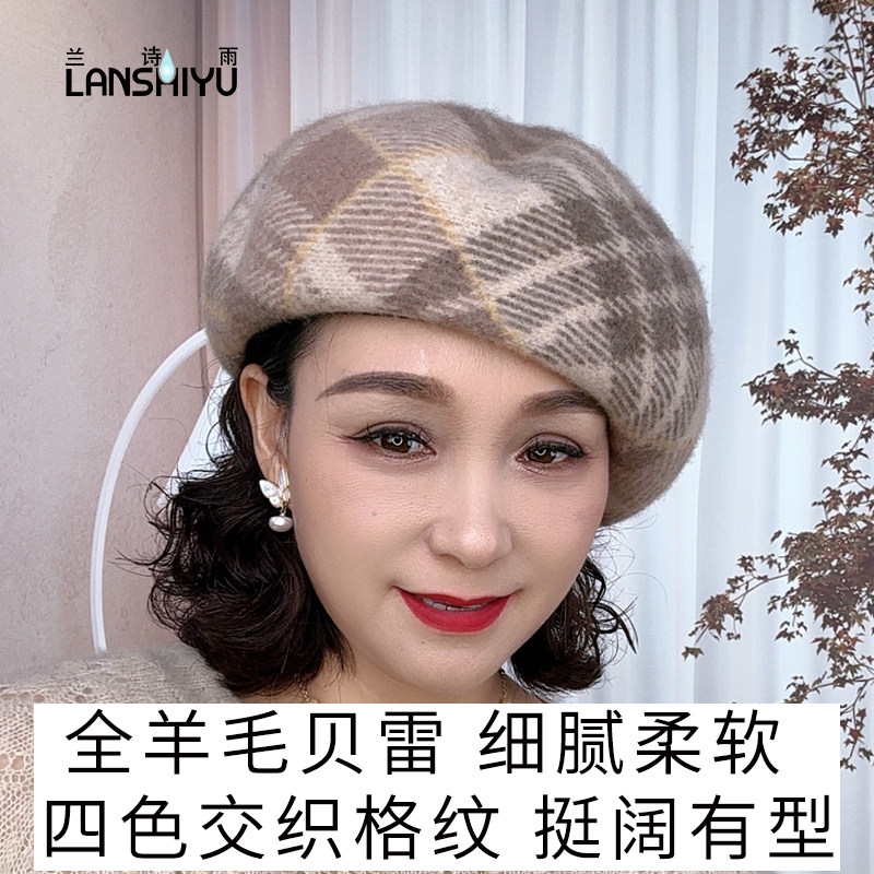 兰诗雨纯绵羊毛贝雷帽女2025秋冬新款保暖帽子显脸小经典格子帽