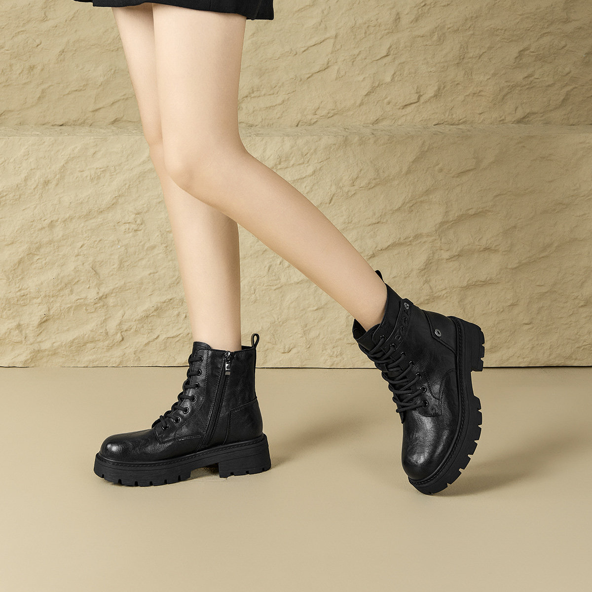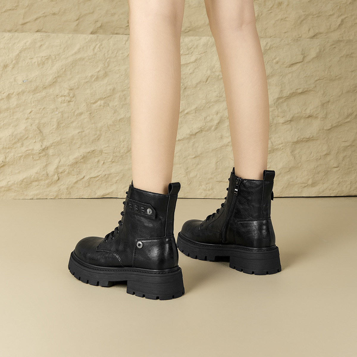天美意粗跟厚底增高加绒英伦马丁靴女鞋子休闲短靴皮靴2025冬新款
