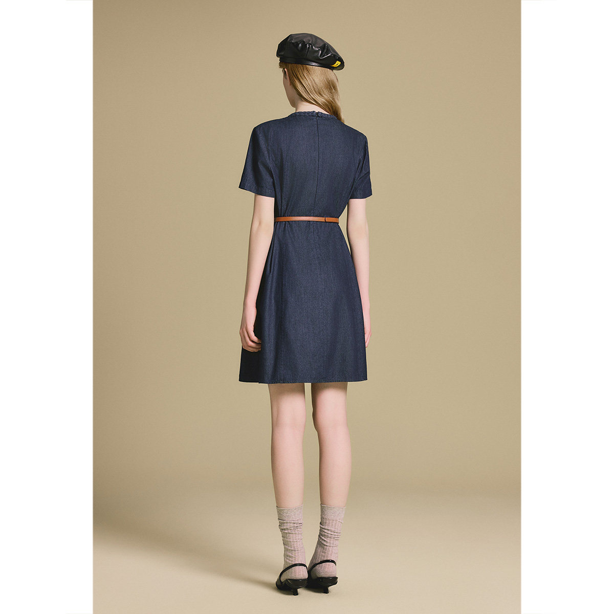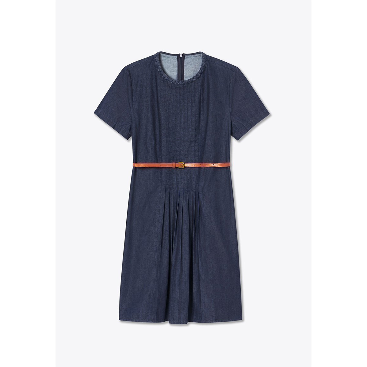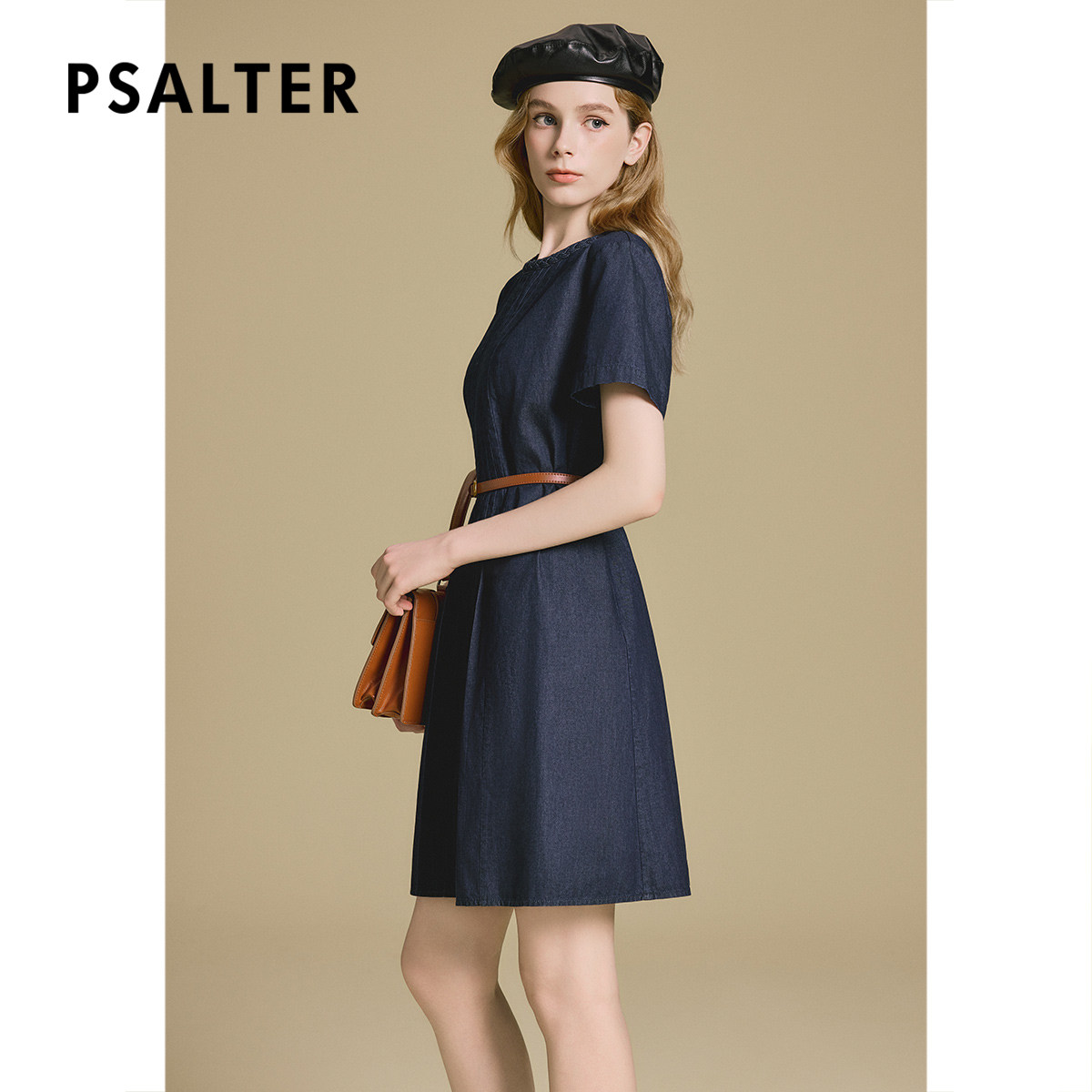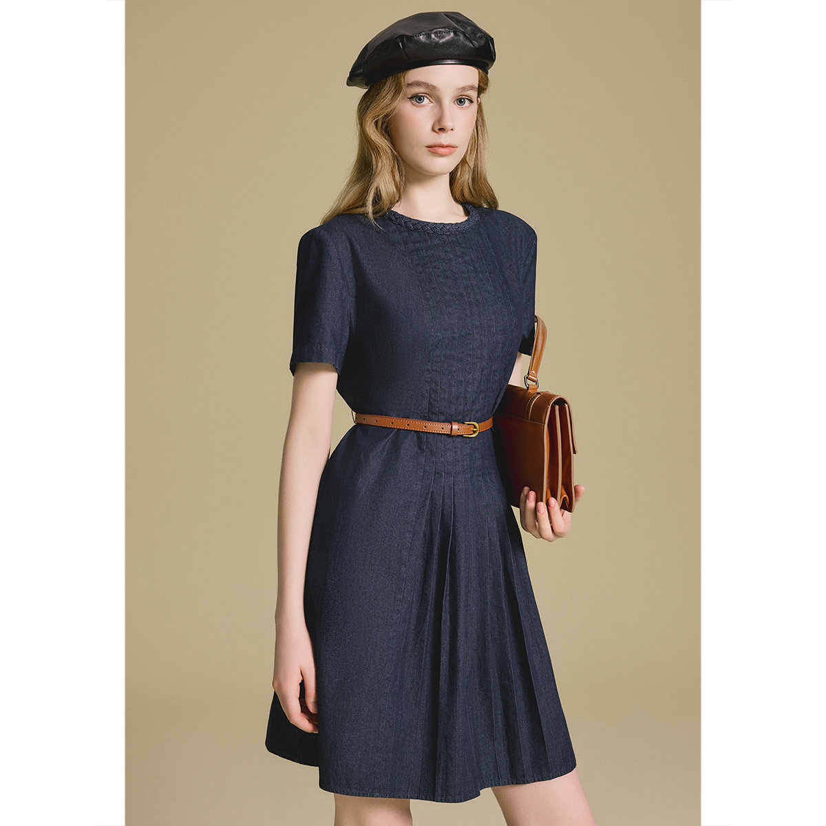 诗篇专选轻薄透气H型风琴褶牛仔连衣裙配腰带2025秋款