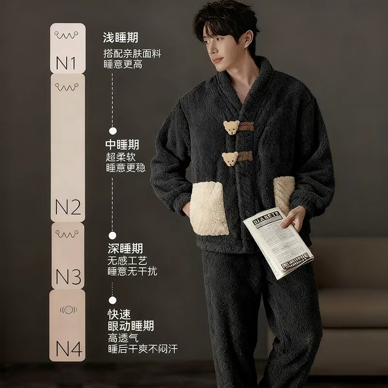 男士睡衣冬季珊瑚绒三层夹棉加厚加绒男款青少年2025年新款家居服