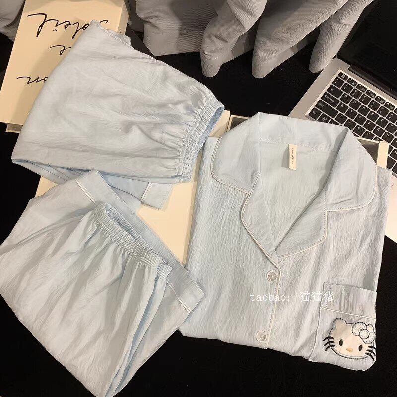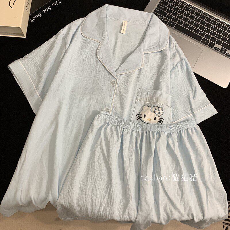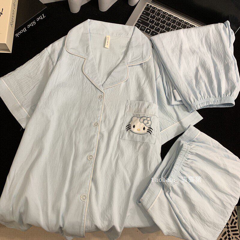 KT猫纯色棉绸睡衣女夏天纯棉纱布短袖薄款家居服三件套装短裤企鹅