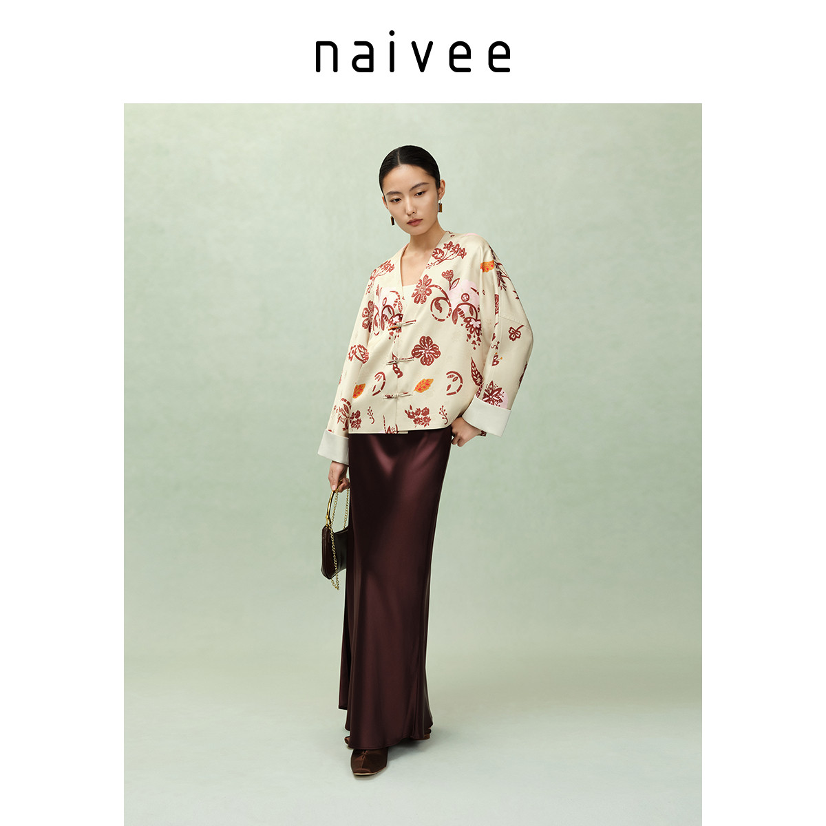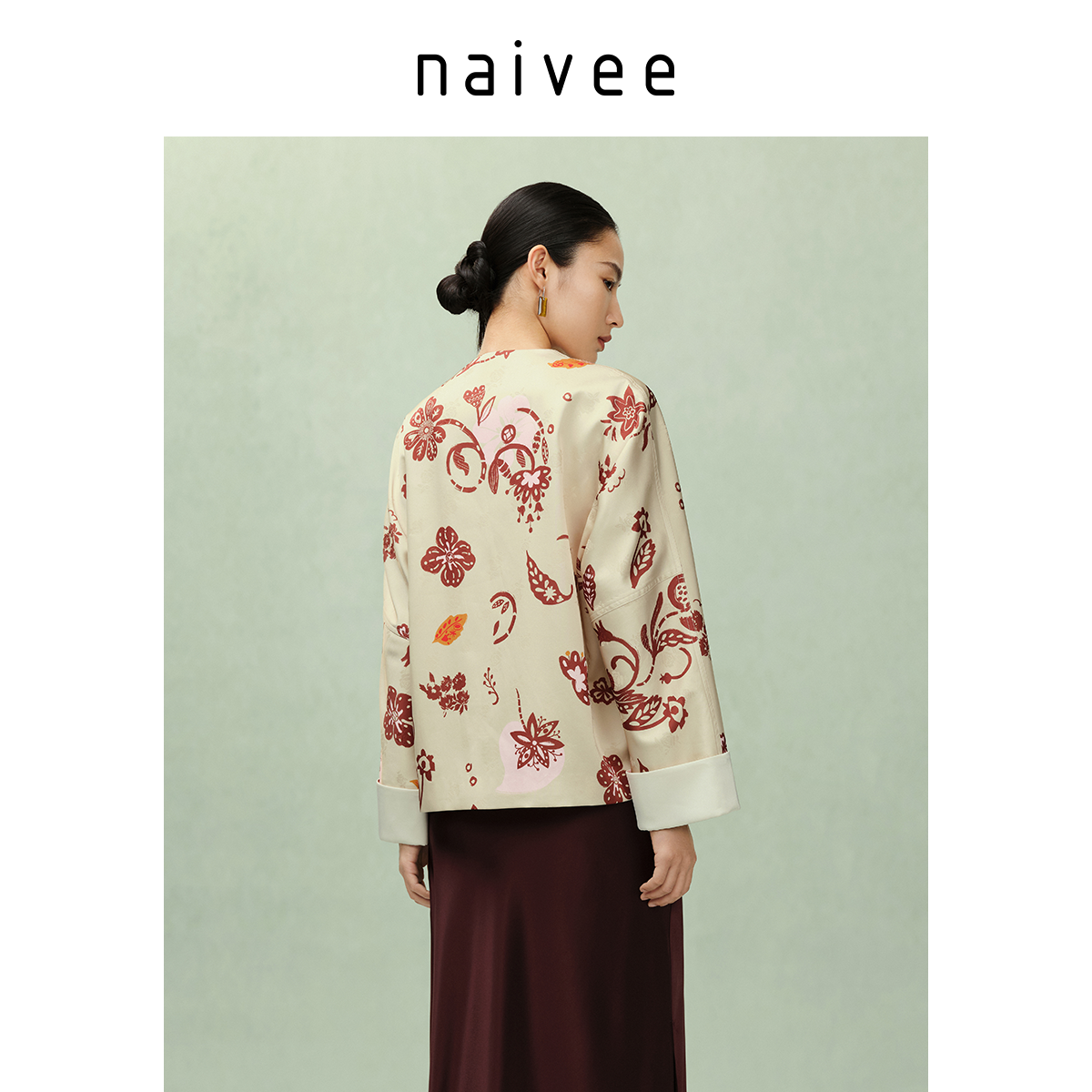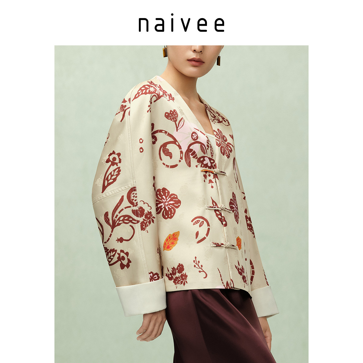 新中式富贵花外套』naivee纳薇25秋新款V领国风印花缎面提花上衣