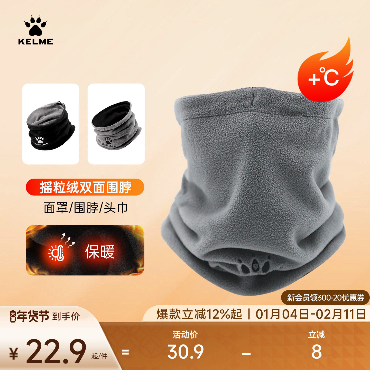 KELME卡尔美防寒双面抓绒运动围脖秋冬户外跑步足球训练保暖面罩