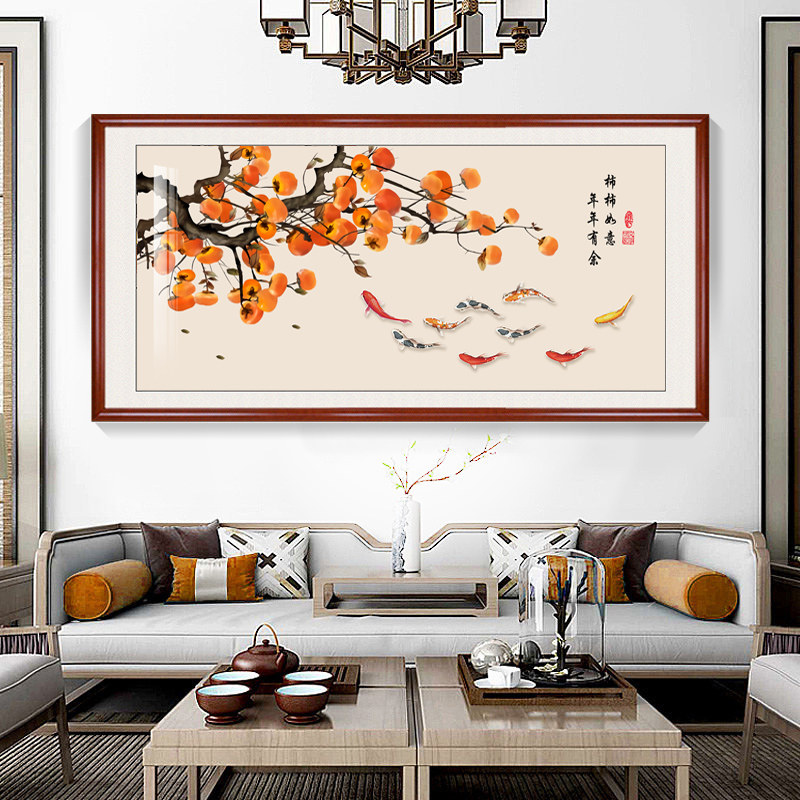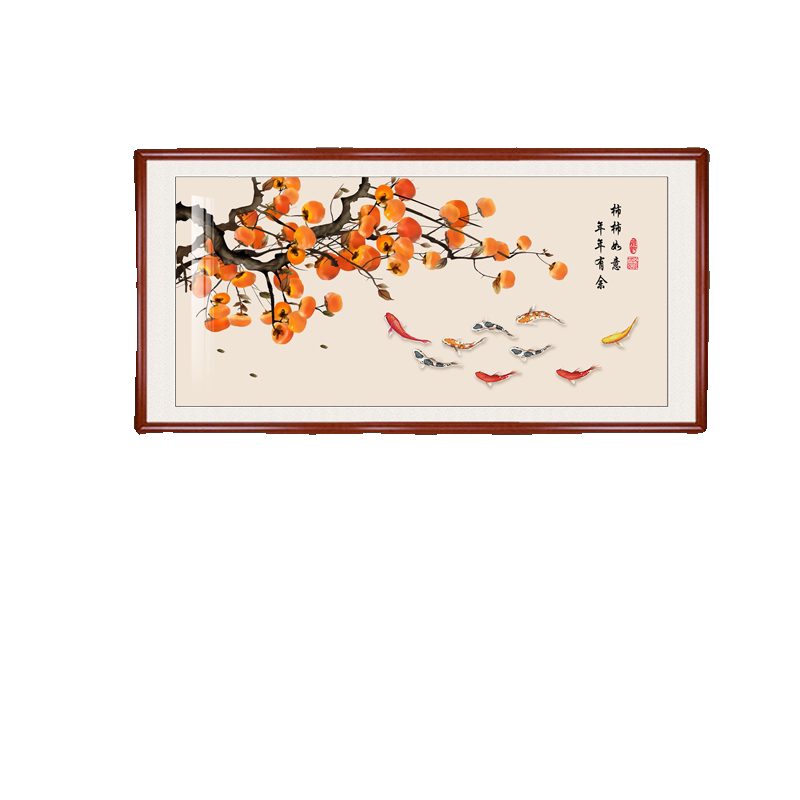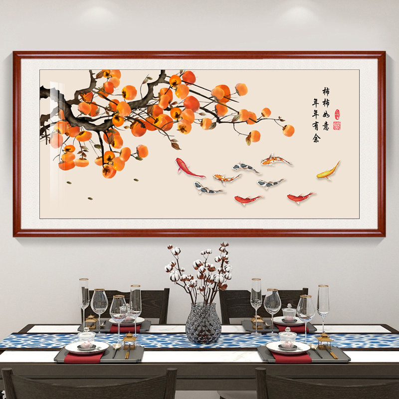 新中式事事如意餐厅装饰画客厅饭厅背景墙壁画九鱼图柿子挂画