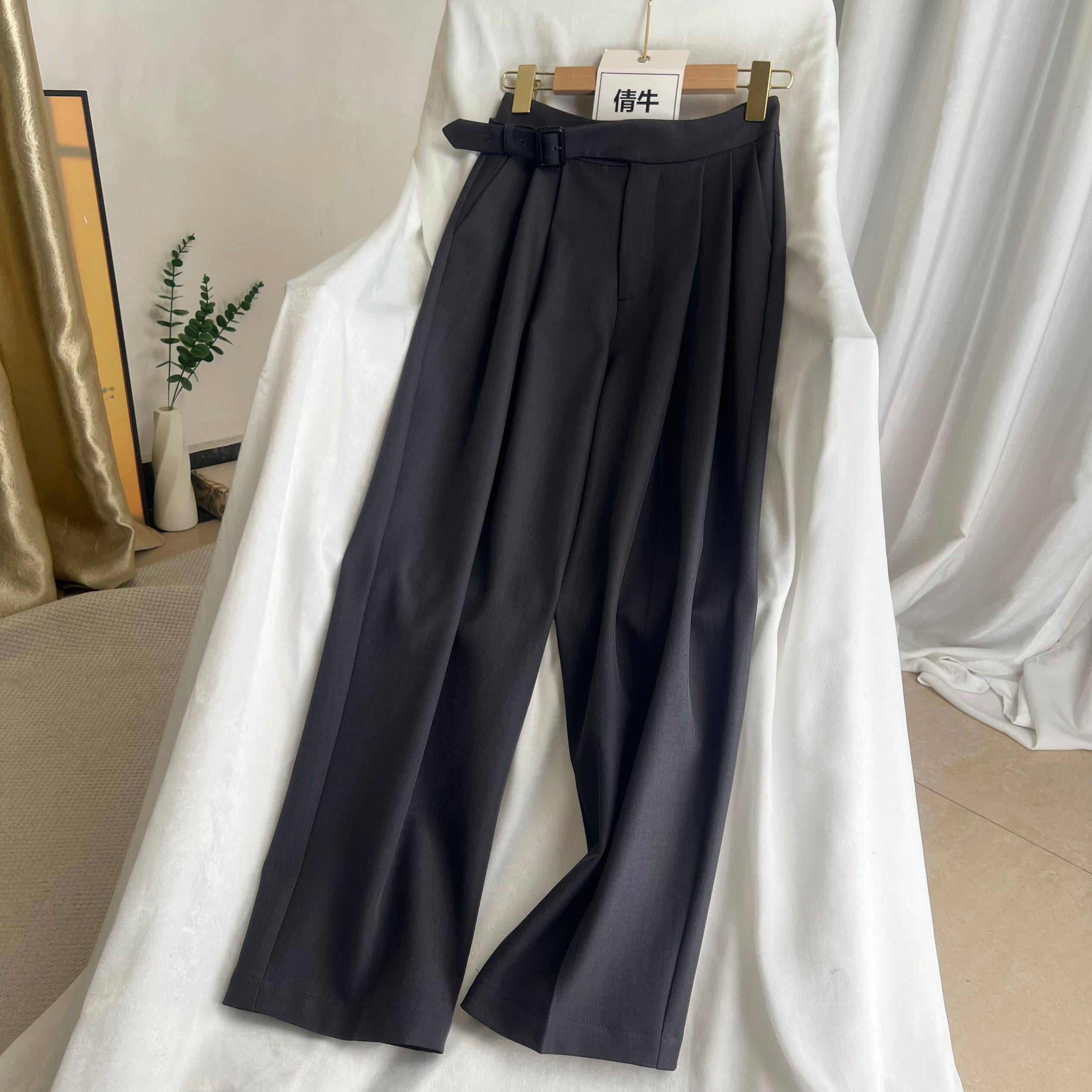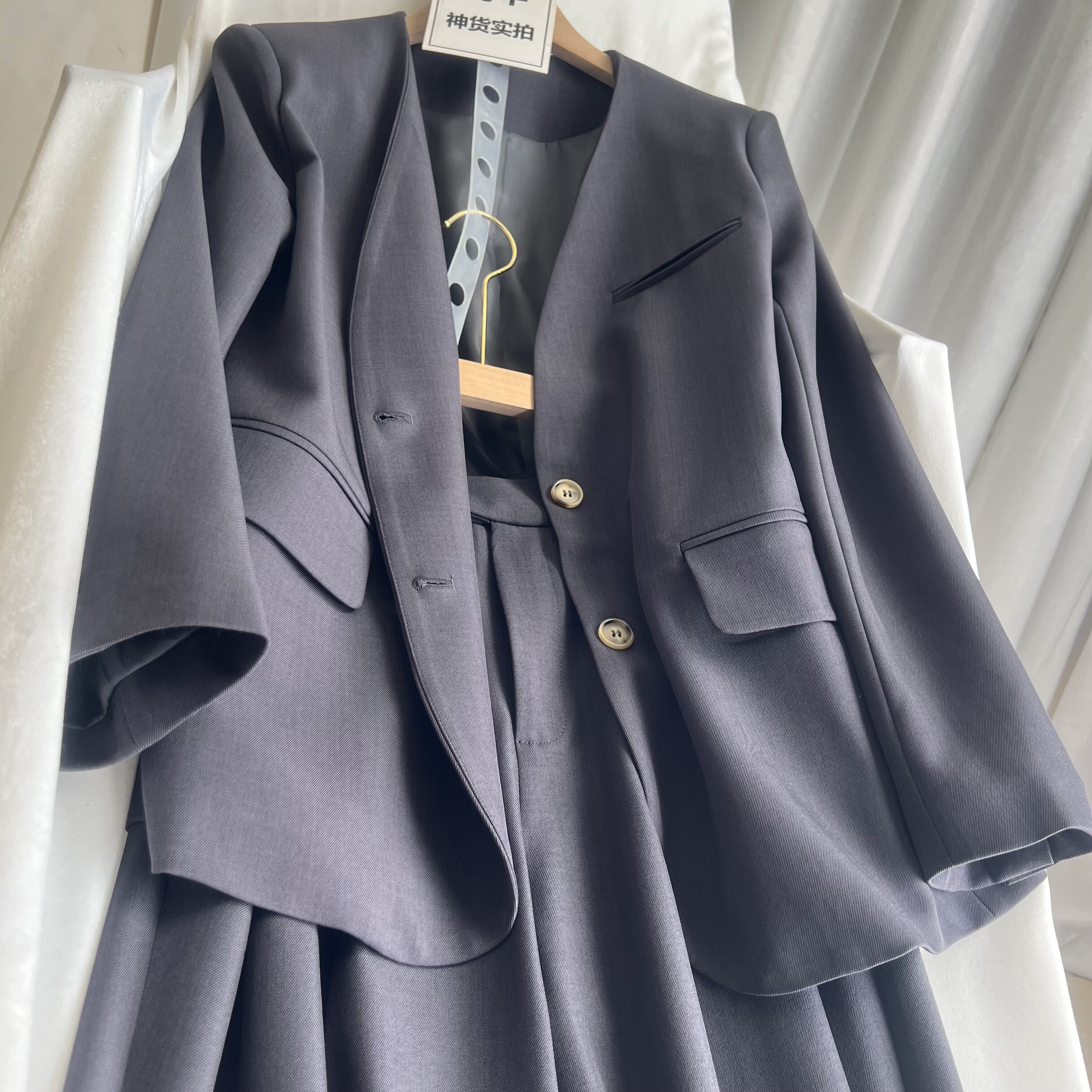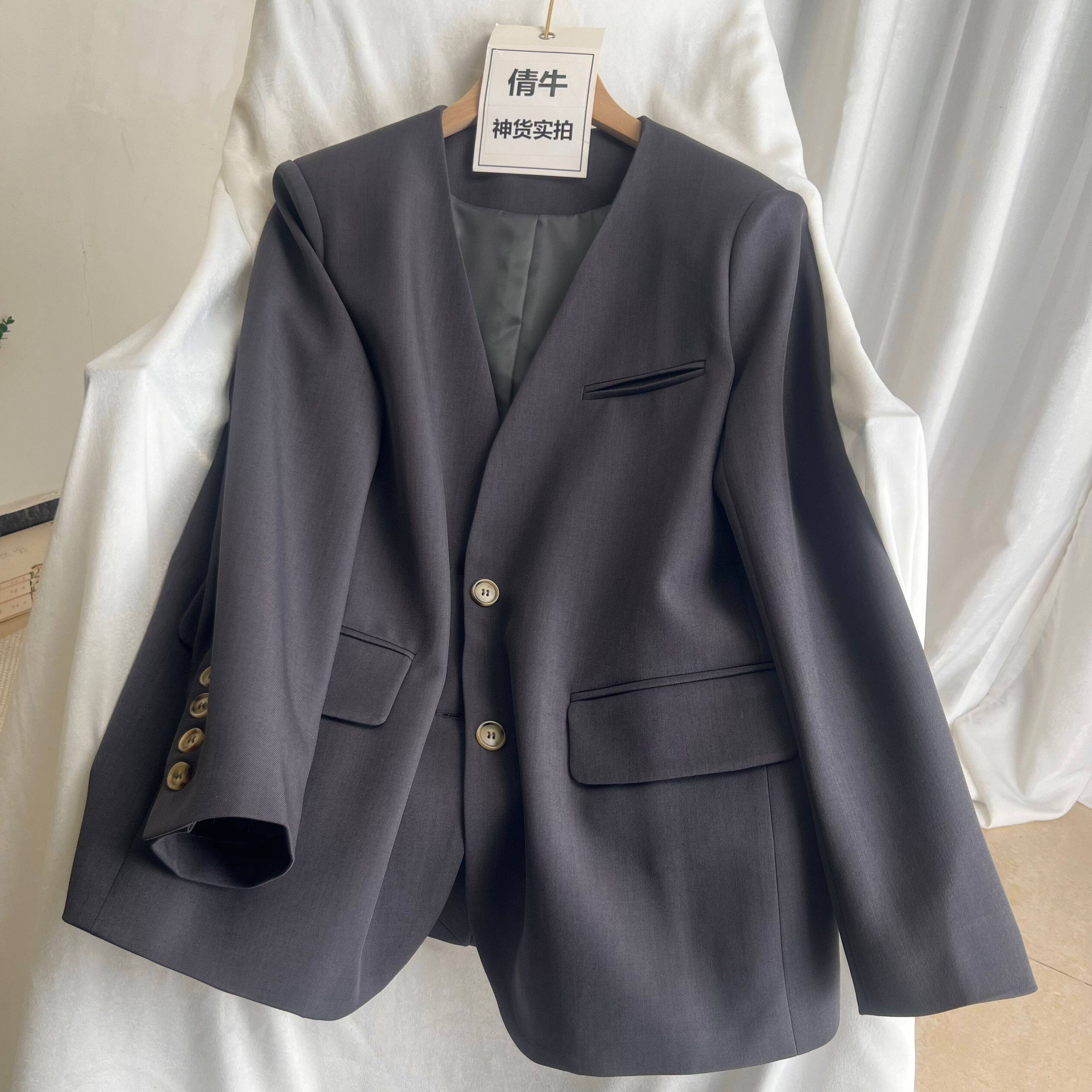 倩牛高端】高级灰无领极简风西装女套装宽松V领外套+哈伦九分西裤