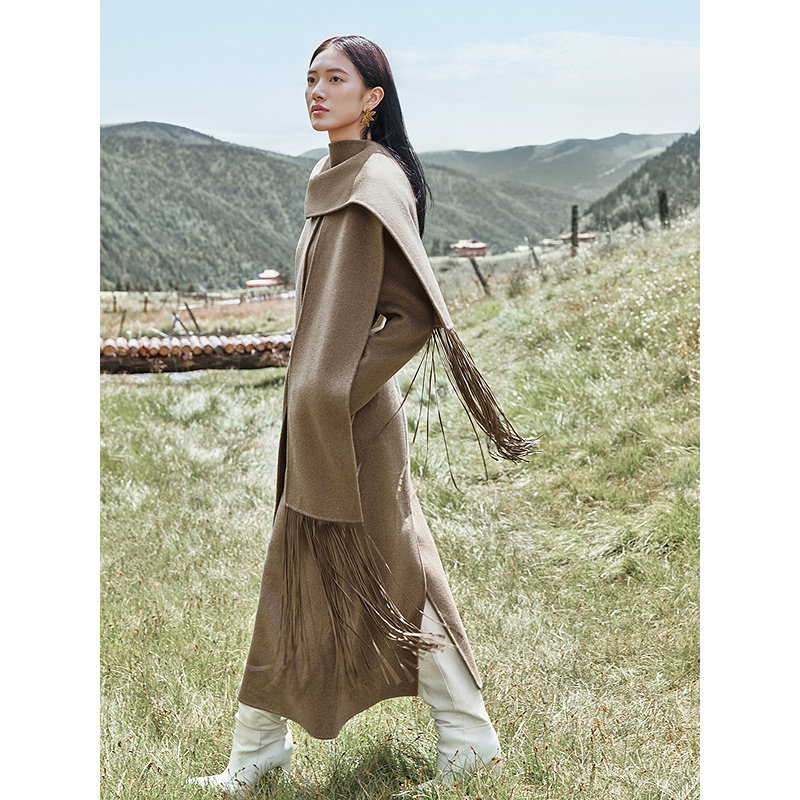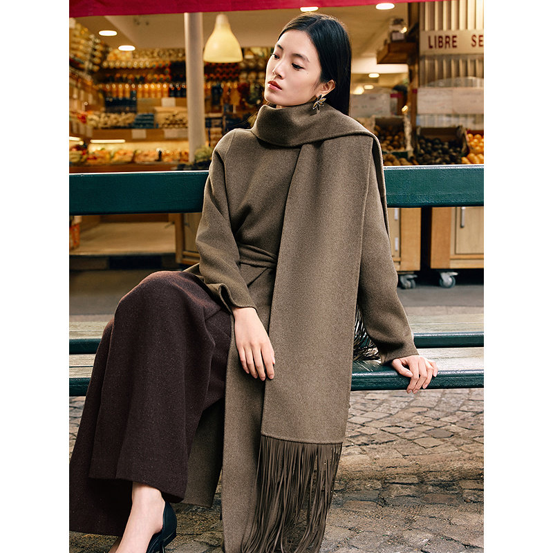 YINER音儿2025冬季新款阿尔巴斯羊绒混纺围巾式流苏H型毛呢大衣