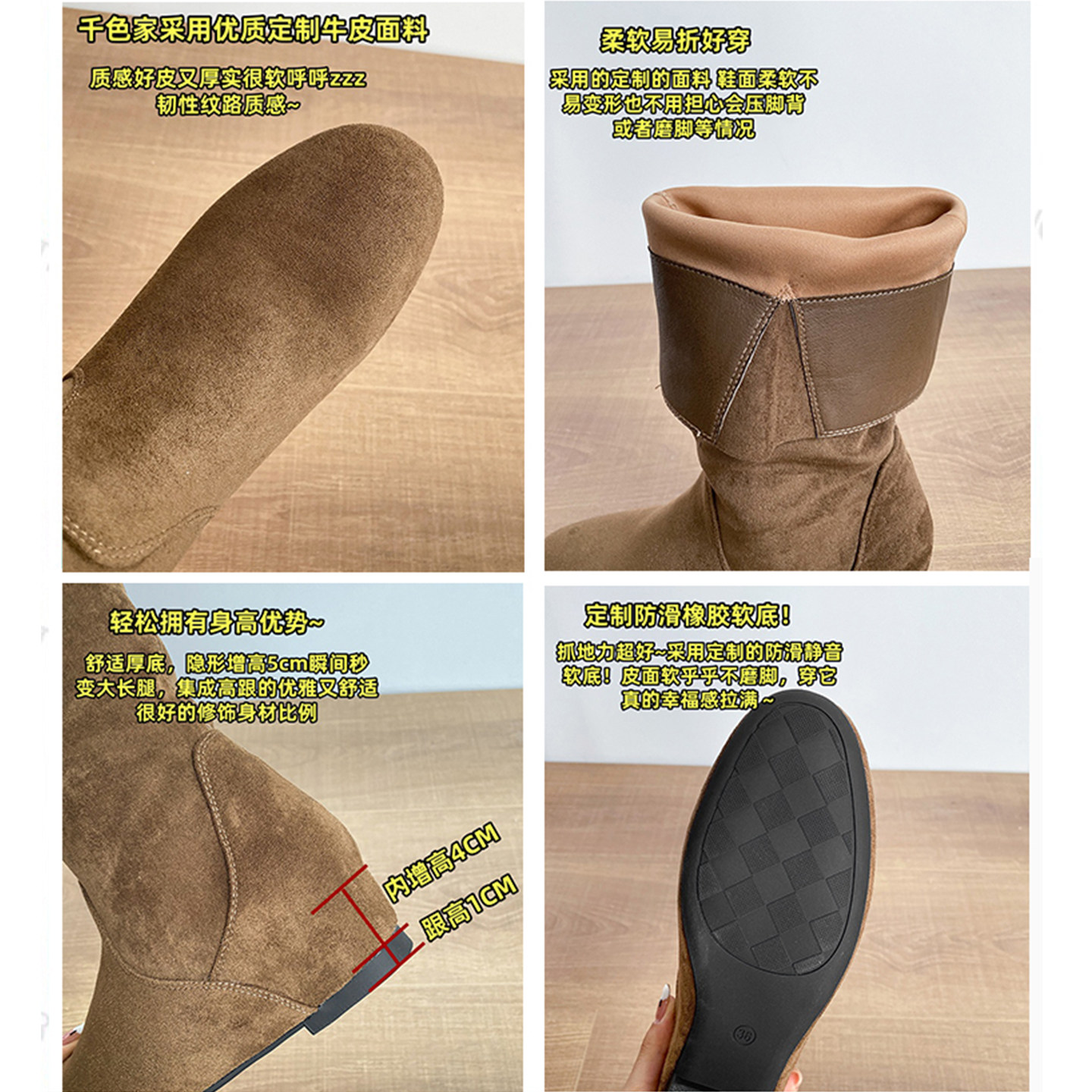 羊皮版~内增高长筒靴女2025新款秋冬卡其色高筒长靴小个子堆堆靴