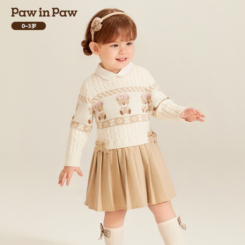 PawinPaw卡通小熊童装秋冬女童连衣裙拼接公主风可爱裙子