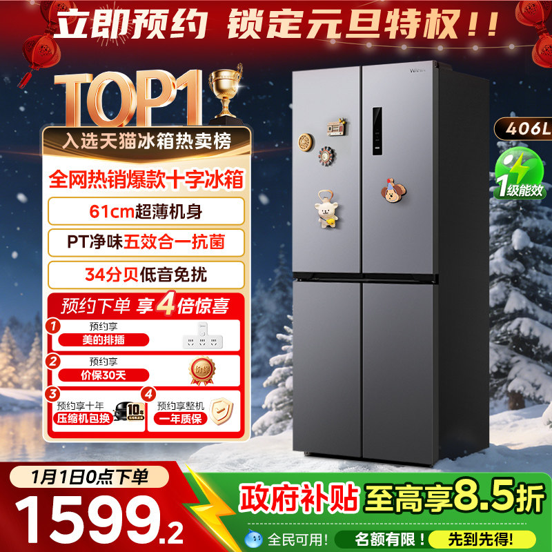 美的华凌426十字四门电冰箱家用风冷无霜超薄嵌入式净味一级能效