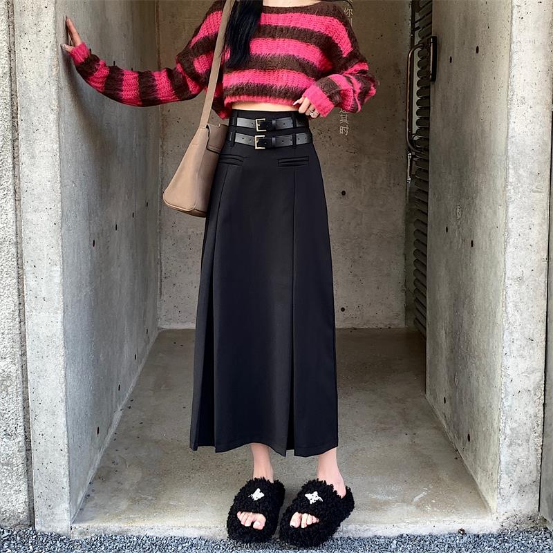 高腰设计感百褶半身裙女中长款春季大码灰色a字西装休闲包臀长裙