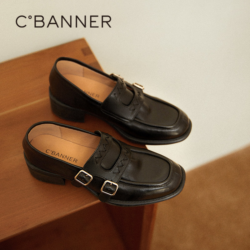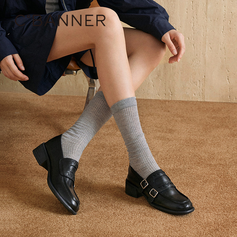 千百度中跟厚底乐福鞋女款2025秋季新款通勤小皮鞋牛皮深口单鞋